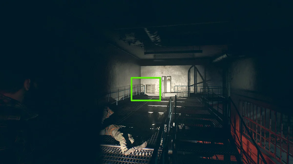Лезьте в вентиляционную шахту и выберетесь на лестничный пролёт. Двигайтесь вниз и убейте издалека лежавшего на полу заражённого, а затем протиснитесь под стеллажом.