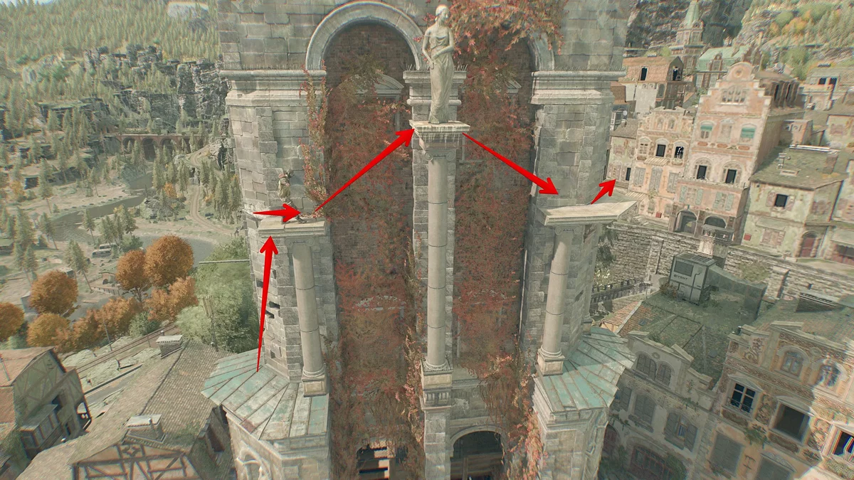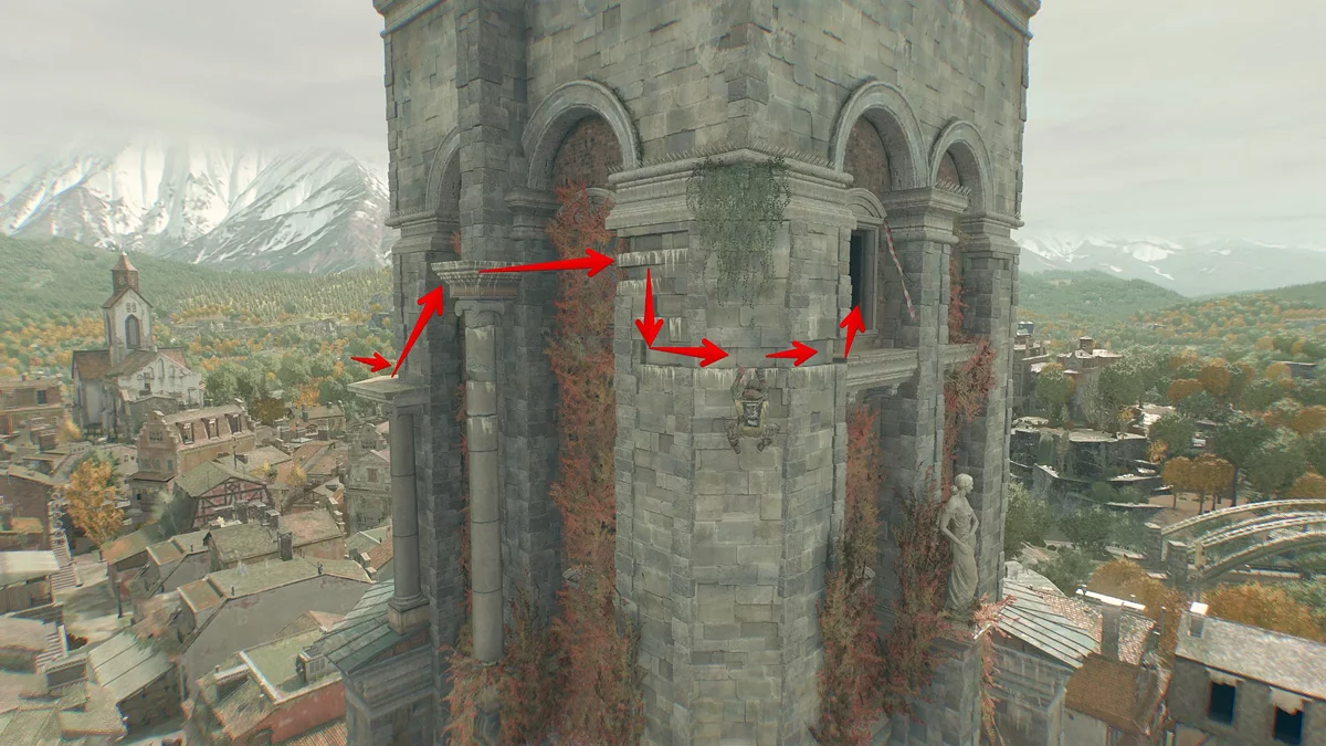 Теперь прыгайте на колонну, а затем на выступы в стене. Немного спуститесь и ползите направо до окна.