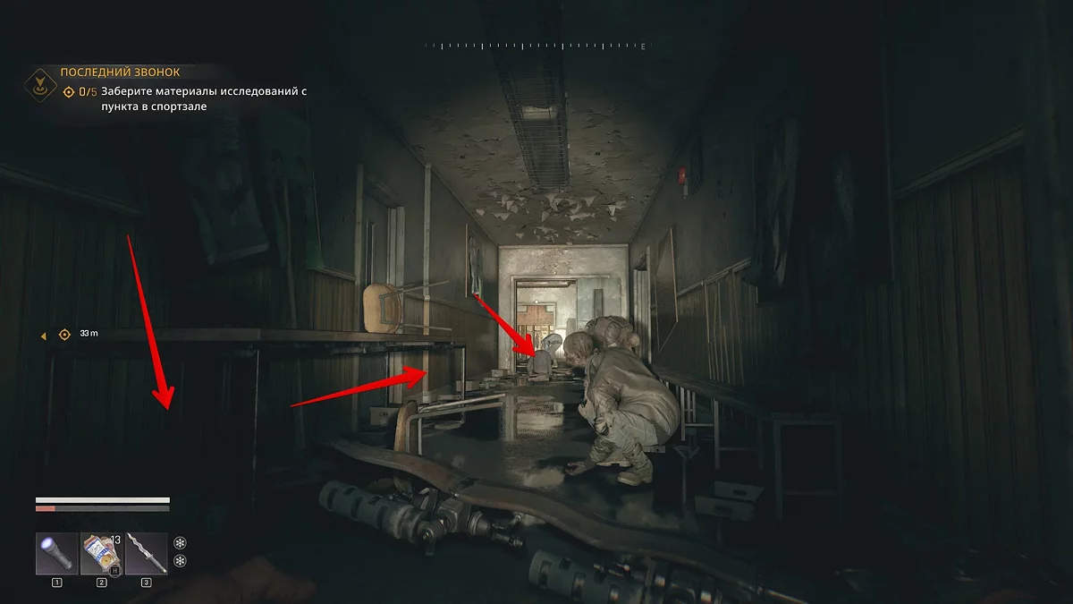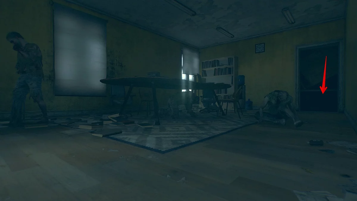 Пройдите под столом, убейте со спины заражённого слева и пролезьте в следующую комнату. Впереди будет длинный коридор, по которому бродит прыгун.
