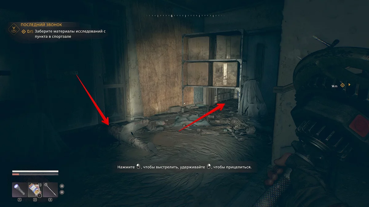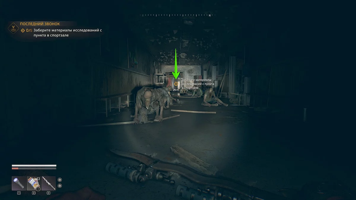 [b]Темная зона — область, населенная зараженными. Главная опасность — прыгун в смирительной рубашке. Он может заметить героя и привлечь внимание остальных противников. Поэтому не попадайтесь на глаза или убейте со спины либо метким выстрелом в голову из лука. Остальные противники не тронут героя, если не будете шуметь.