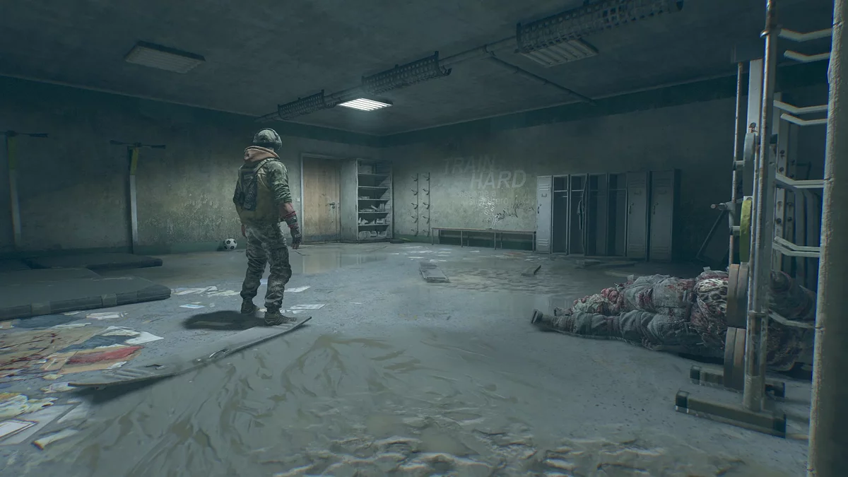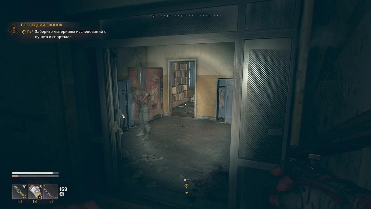 В последнем коридоре будет много зараженных и бегун. Теоретически можно с боем прорваться к проходу в конце. Но лучше воспользоваться раздевалками справа и аккуратно пройти мимо.