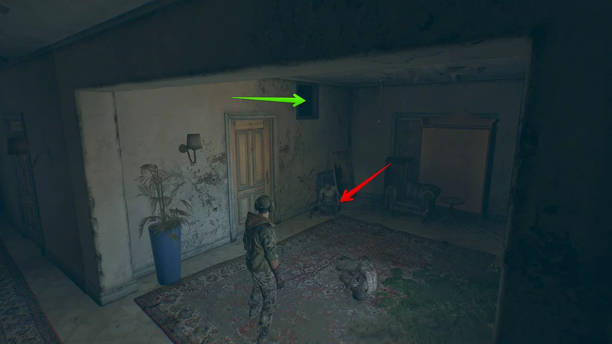 Зайдите в подъезд, спуститесь на первый этаж, где находится толстяк, бегун и пара зараженных. Откройте двухстворчатую деревянную дверь слева от рояля. Ученый цел, и его заберут люди из северной общины. Оливия скажет, что Камило — главный биолог барона, и предложит встретиться в промзоне, чтобы убить новую химеру.