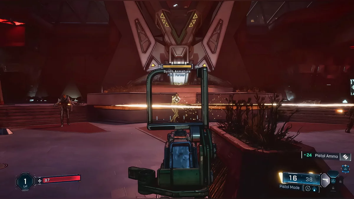 Двигайтесь за Арджеем и спускайтесь вниз. Вскоре вы окажетесь в просторном помещении, где на вас нападут синты. Стреляйте им по головам. Если противник будет повержен, прицел на секунду превратится в красный крест. На этом этапе смерть не критична, ведь союзник будет воскрешать вас, если сам в тот момент будет жив. Не забывайте обыскивать ящики вокруг, чтобы пополнять запас патронов. Когда последний робот упадёт, возьмите у Арджея ремкомплект. Это местный аналог аптечек.