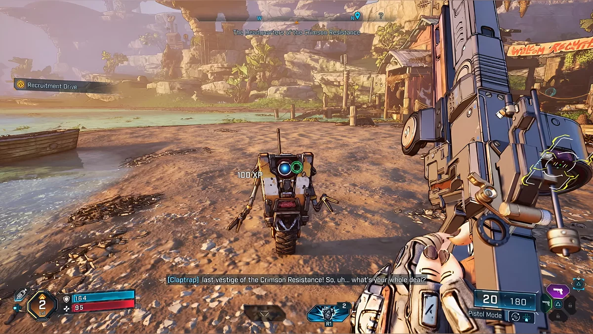Железяка проведёт для вас экскурсию по базе Алого сопротивления. Просто следуйте за ним. По пути можете пострелять по летающим крэчам ради опыта и прогресса в различных достижениях. Затем на вас нападут привычные для серии психи. Оптимальный вариант — держать их на дистанции и расстреливать с дальнего расстояния. После этого двигайтесь к поляне с большим деревом и перебейте кусачей, которые бродят по открытой местности. Наибольшую опасность представляет матёрый хищник, поэтому не давайте ему приблизиться для удара лапой.