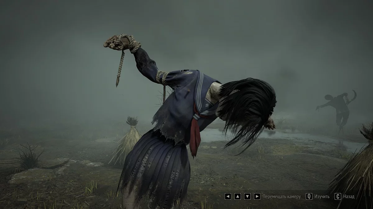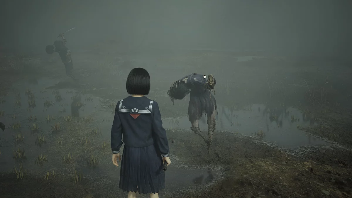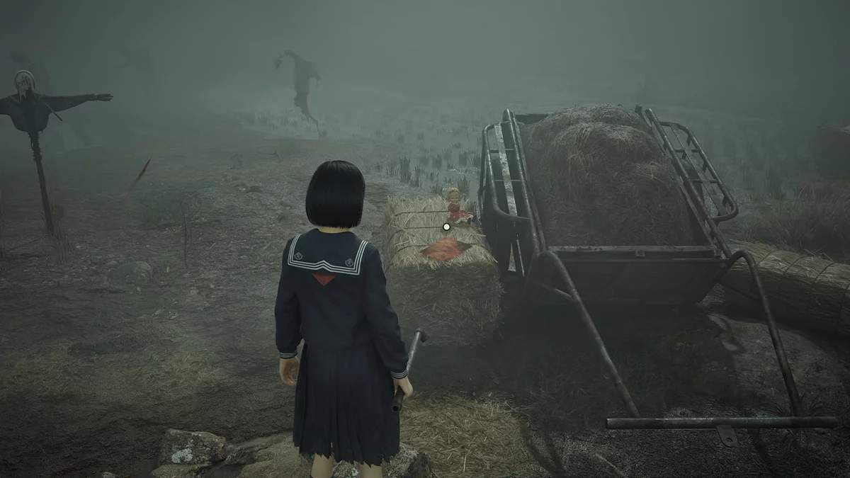 Следуйте вслед за Сю к алтарю и сохранитесь. Двигайтесь до развилки и уйдите налево. Посмотрите катсцену, в которой Хинако вместе с другом вспоминают, как они играли в детстве на рисовых полях. Далее предстоит решить загадку с пугалами.