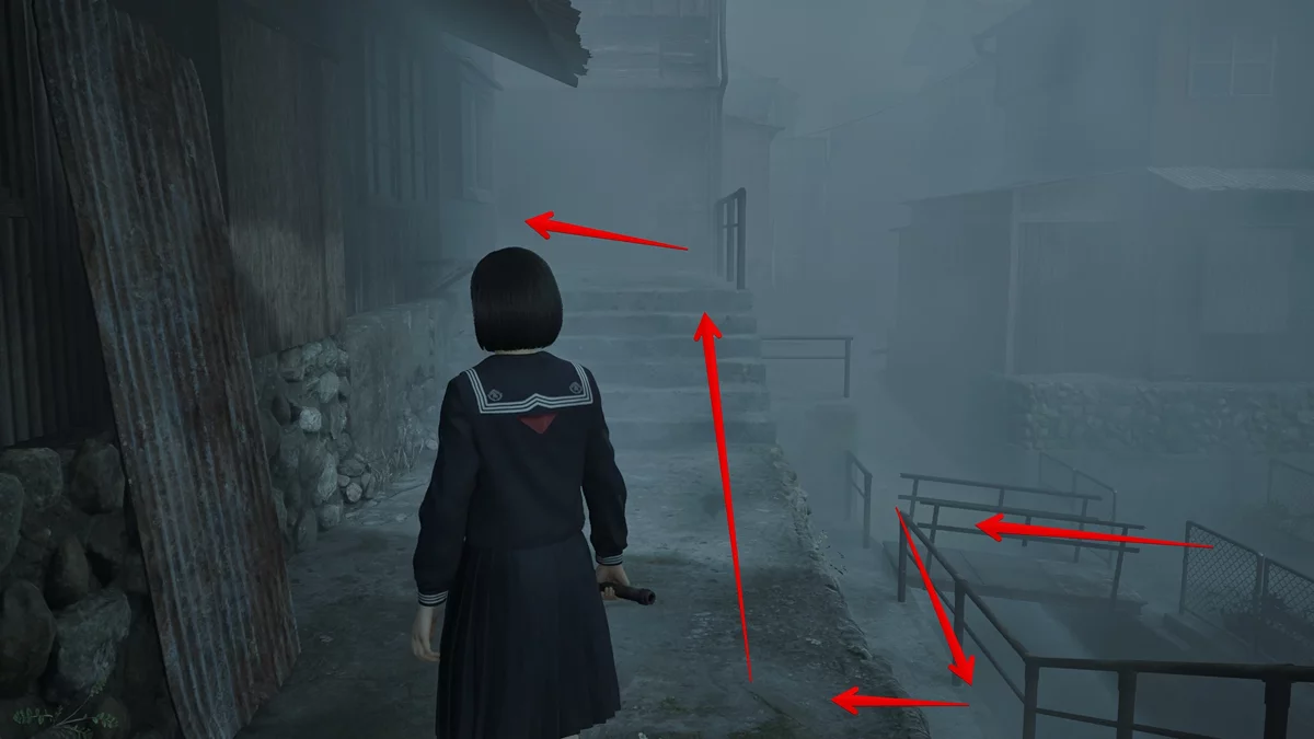 Посмотрите катсцену встречи героини с друзьями, в конце которой начнется погоня от туманного чудовища. Бегите в сторону камеры и в конце поверните налево, затем направо, а потом перепрыгнете через забор.