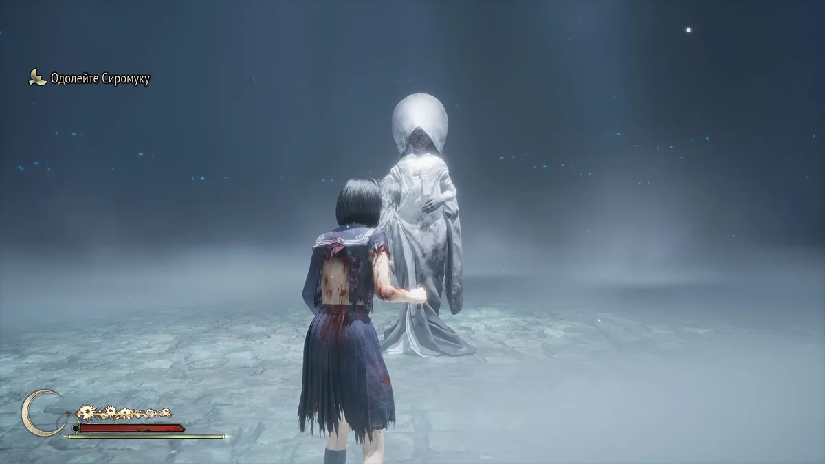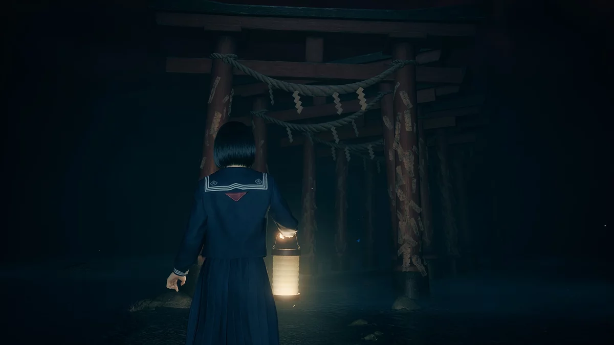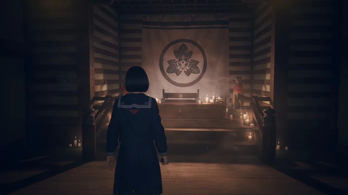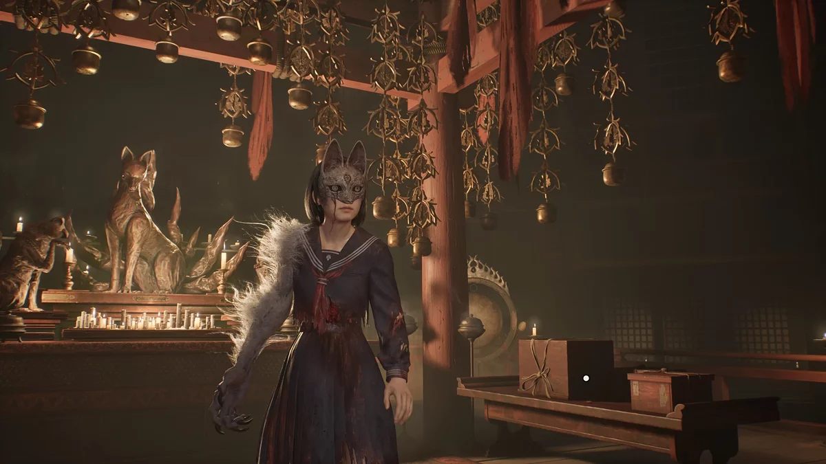 После встречи с туманным чудовищем Хинако оказалась в тёмном святилище. Отправьтесь по коридору вперед и посмотрите катсцену последнего ритуала с мужчиной в маске лисы.