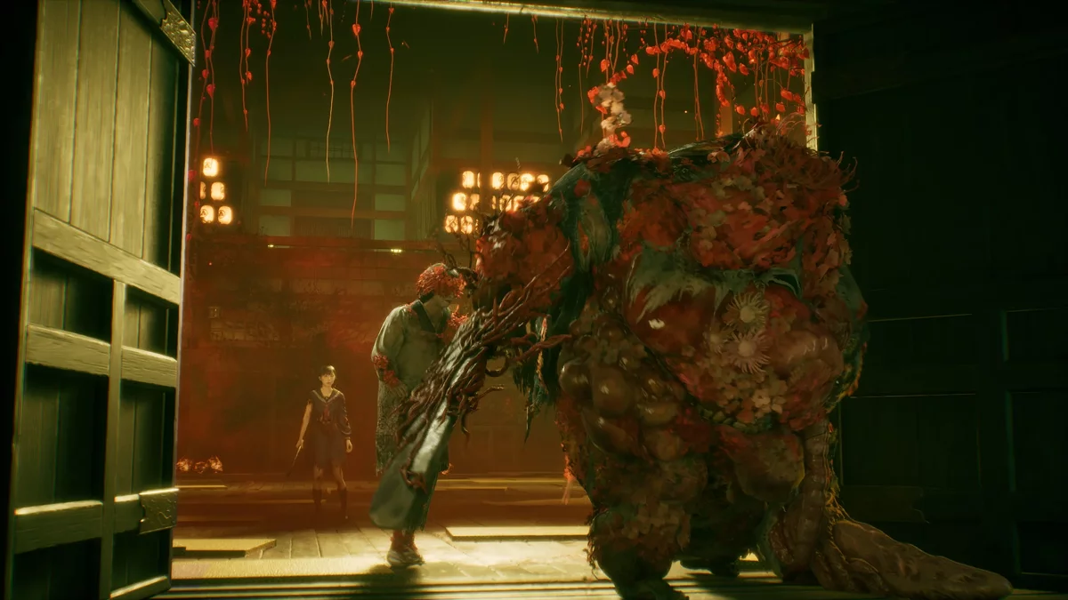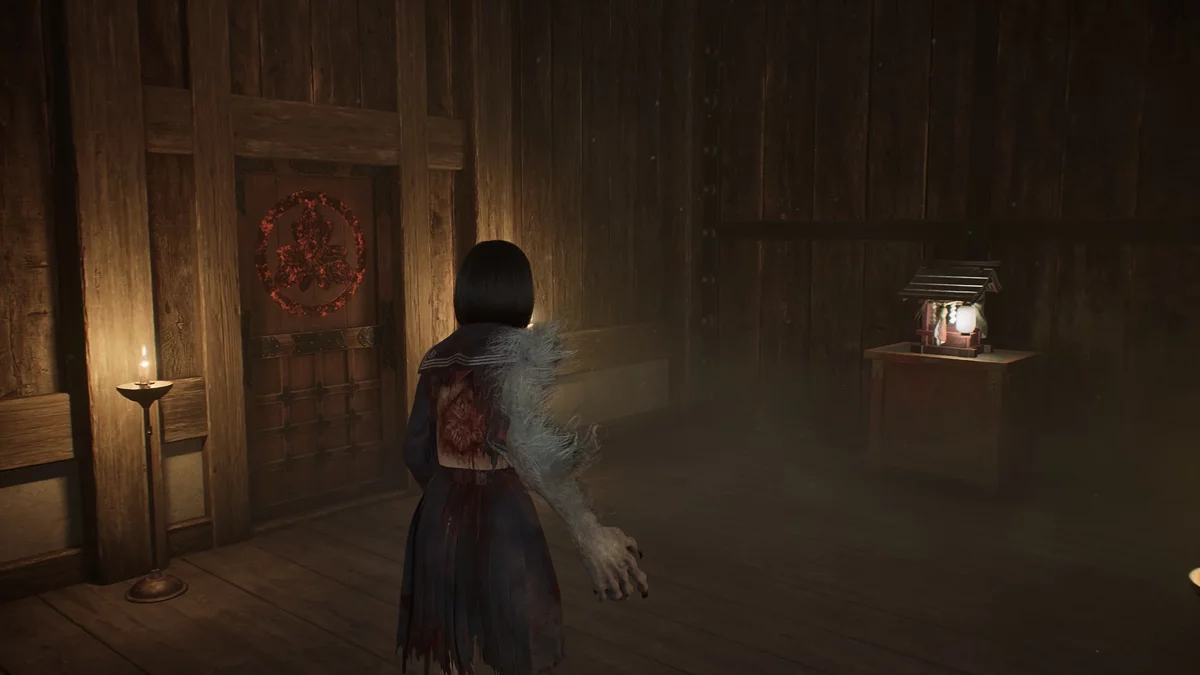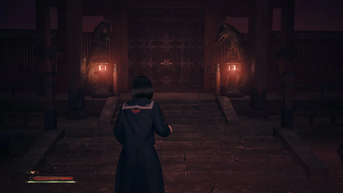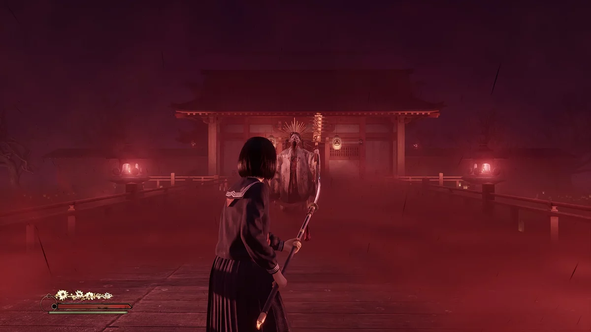 После встречи с туманным чудовищем Хинако оказалась в тёмном святилище. Отправьтесь по коридору вперед и посмотрите катсцену последнего ритуала с мужчиной в маске лисы.