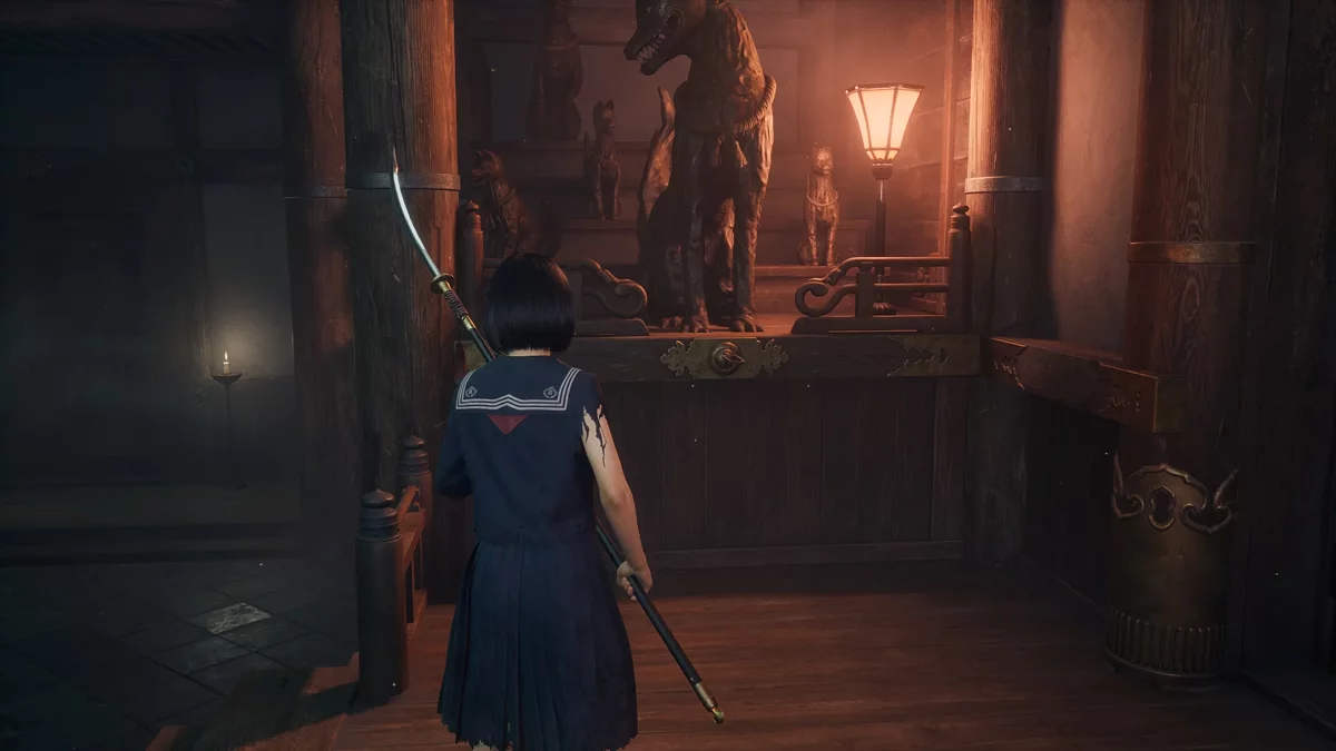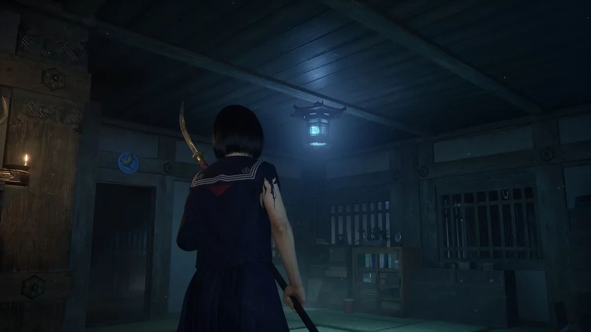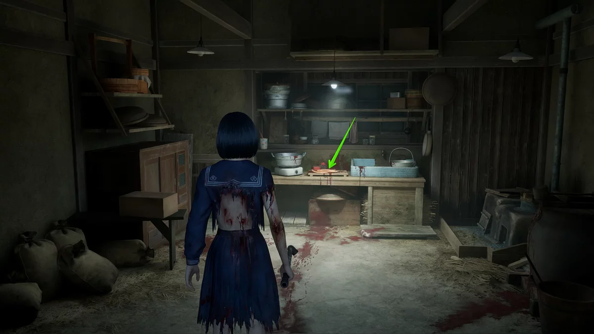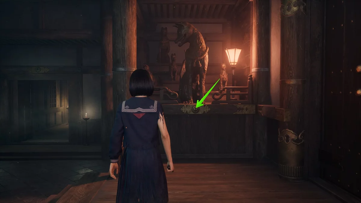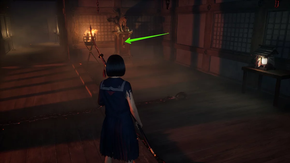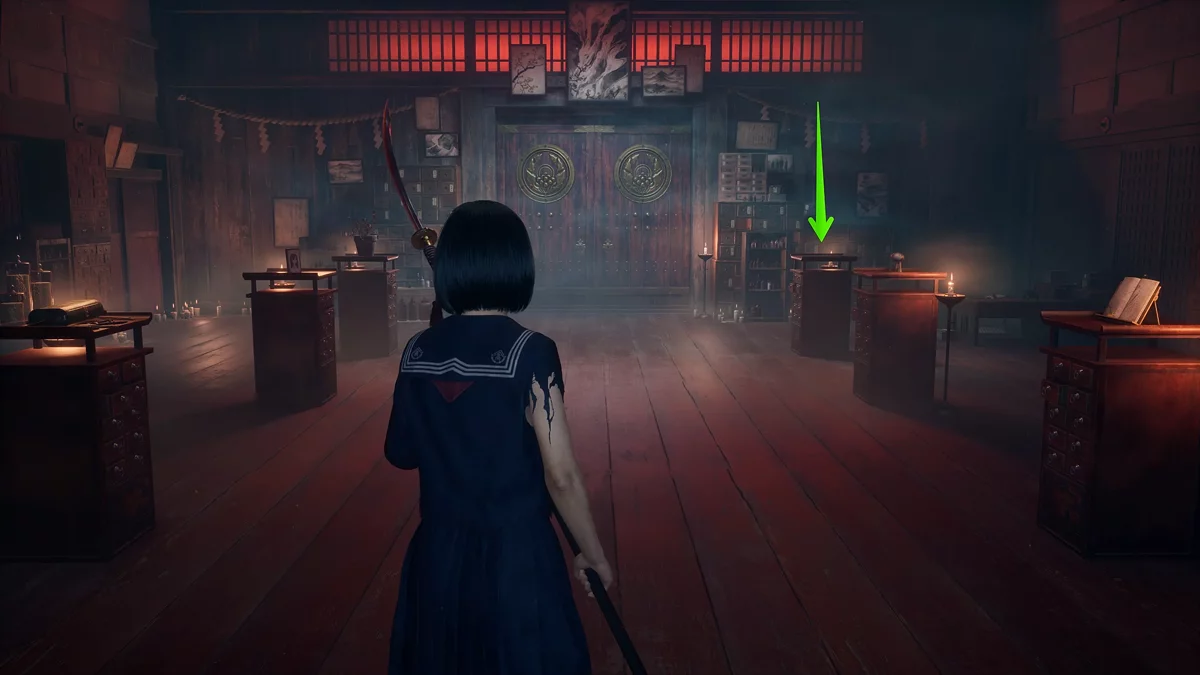 Двигайтесь вперед за мужчиной в маске, у него в руке будет синий фонарь. Далее героиня подберет с алтаря нож кайкэн. После продолжайте следовать за незнакомцем.