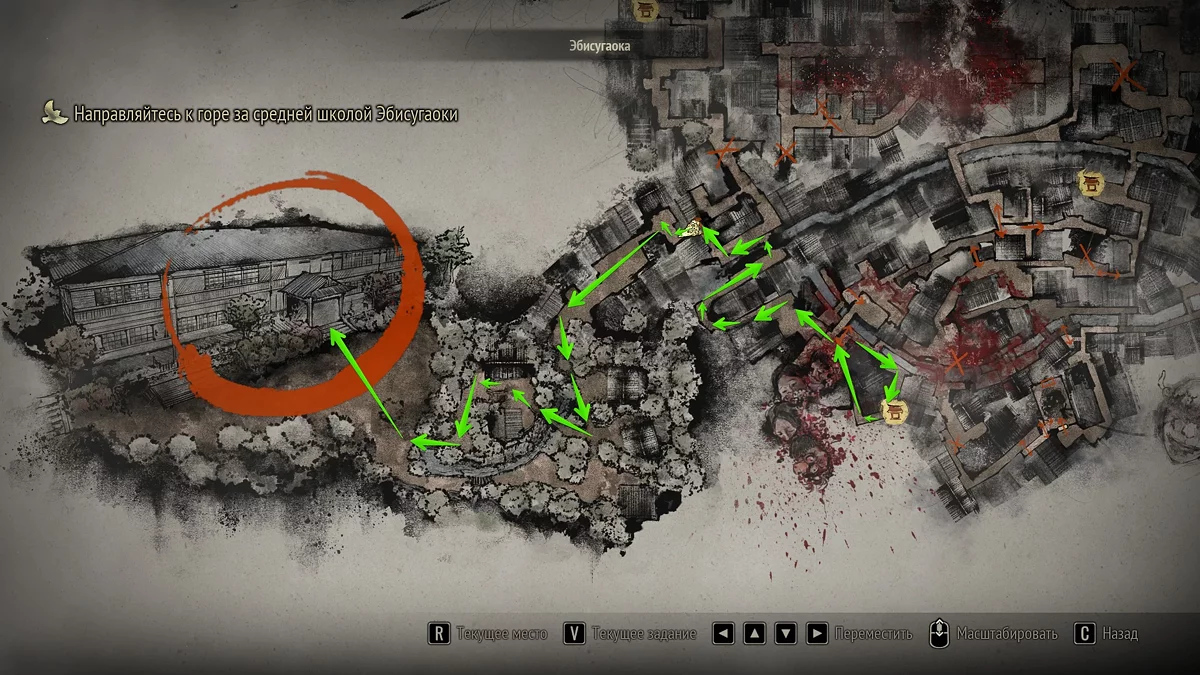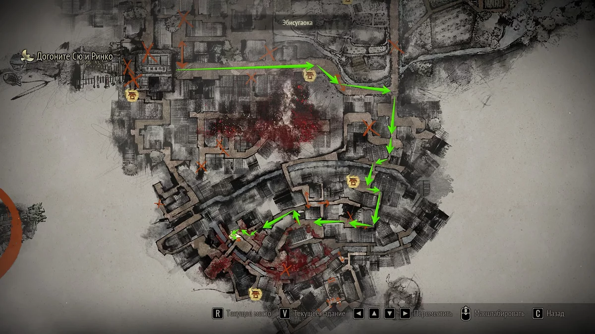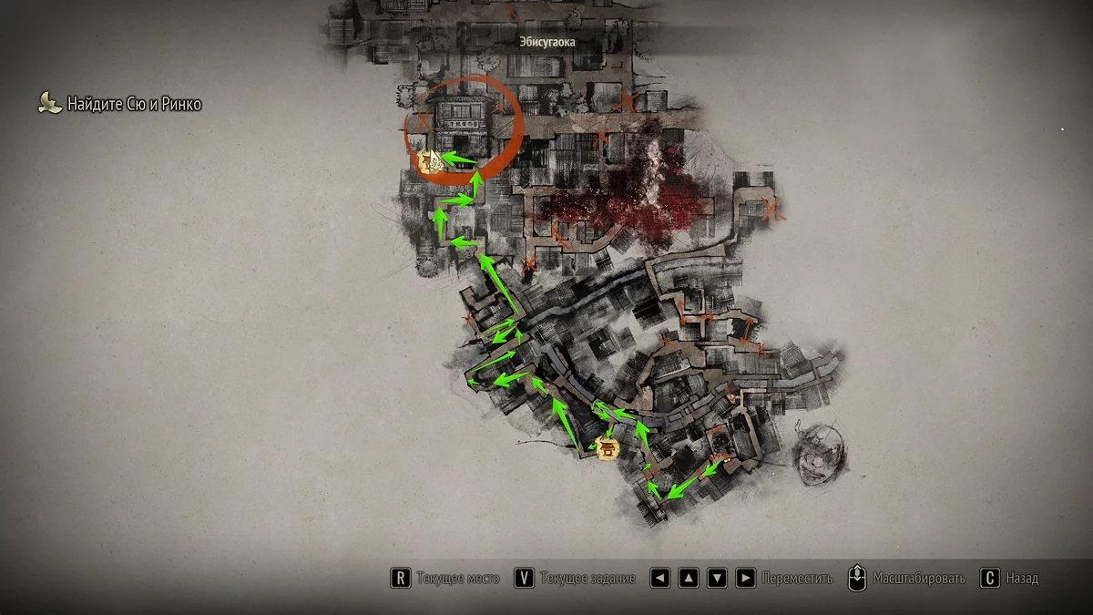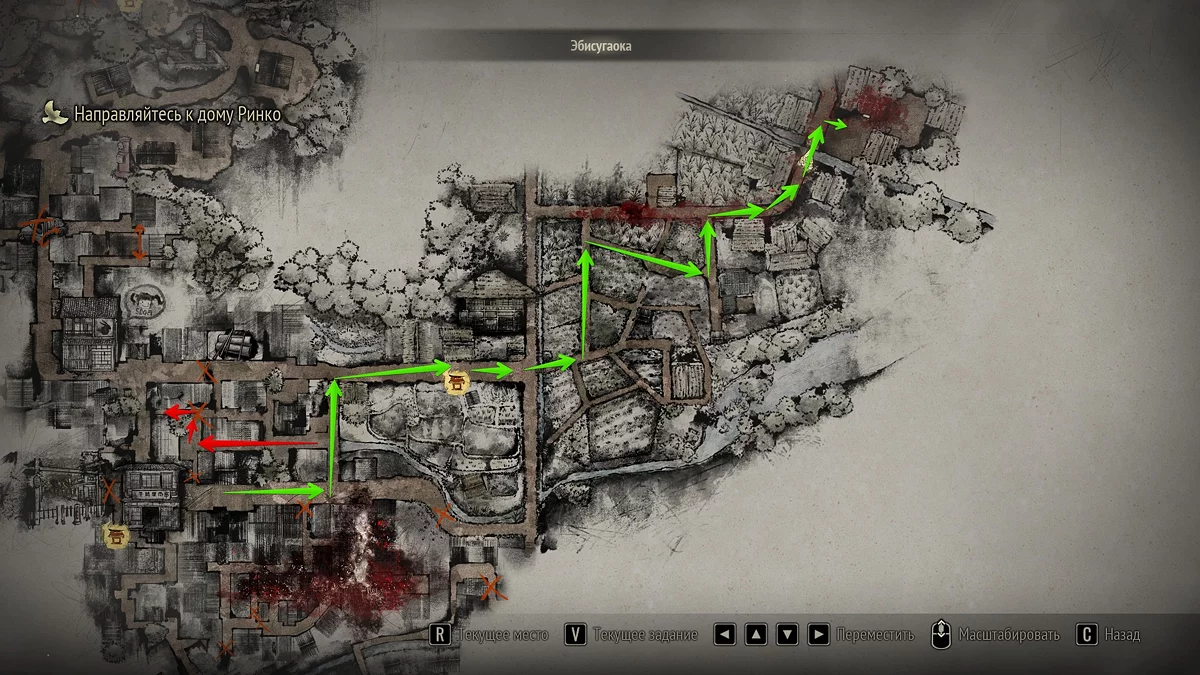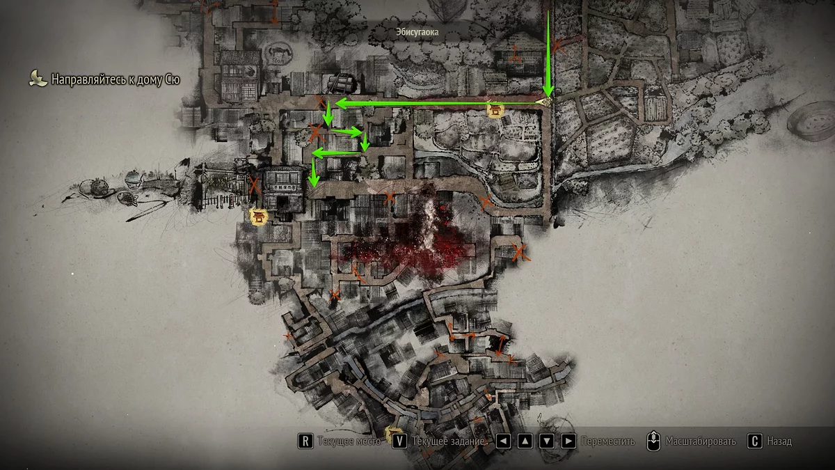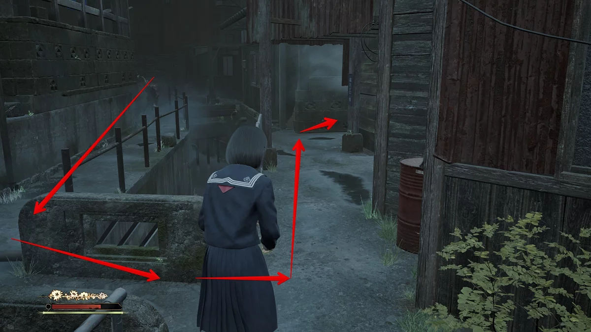 Следуйте от дома Сю по тропе вперёд и сохранитесь у алтаря. Продолжайте движение, пока не встретите матку, которую придется убить. Спускайтесь по дороге и сверните налево за угол, потом идите до перекрестка. Поверните направо, обойдите здание с правой стороны, устраните мечницу и прыгуна. Лезьте под бревно и войдите в город.