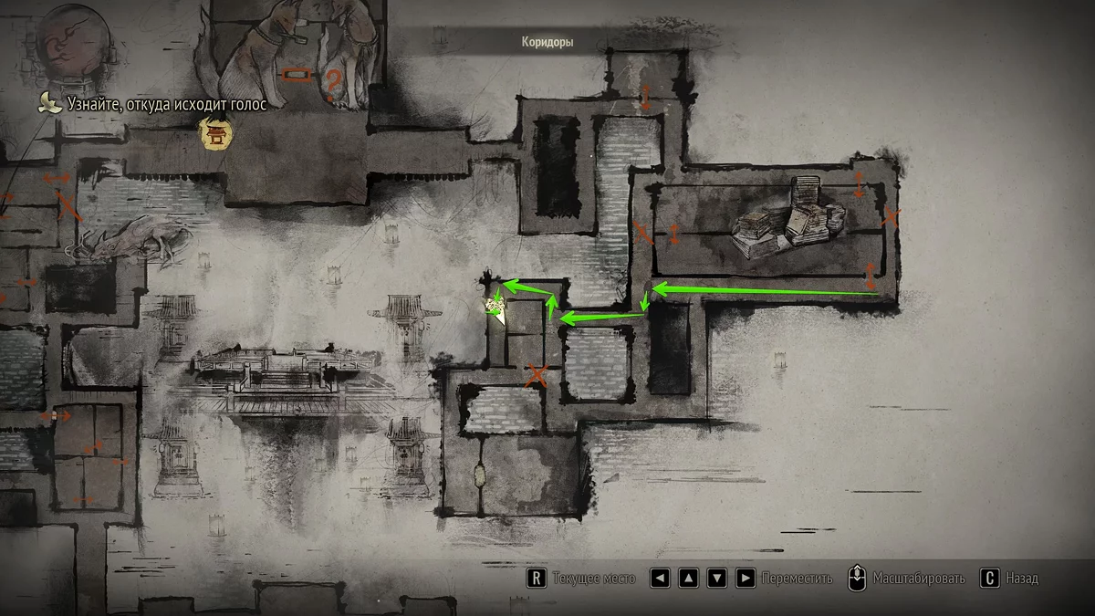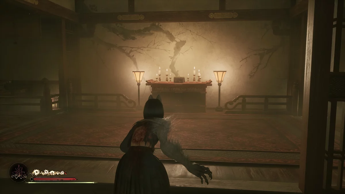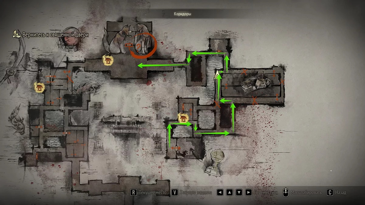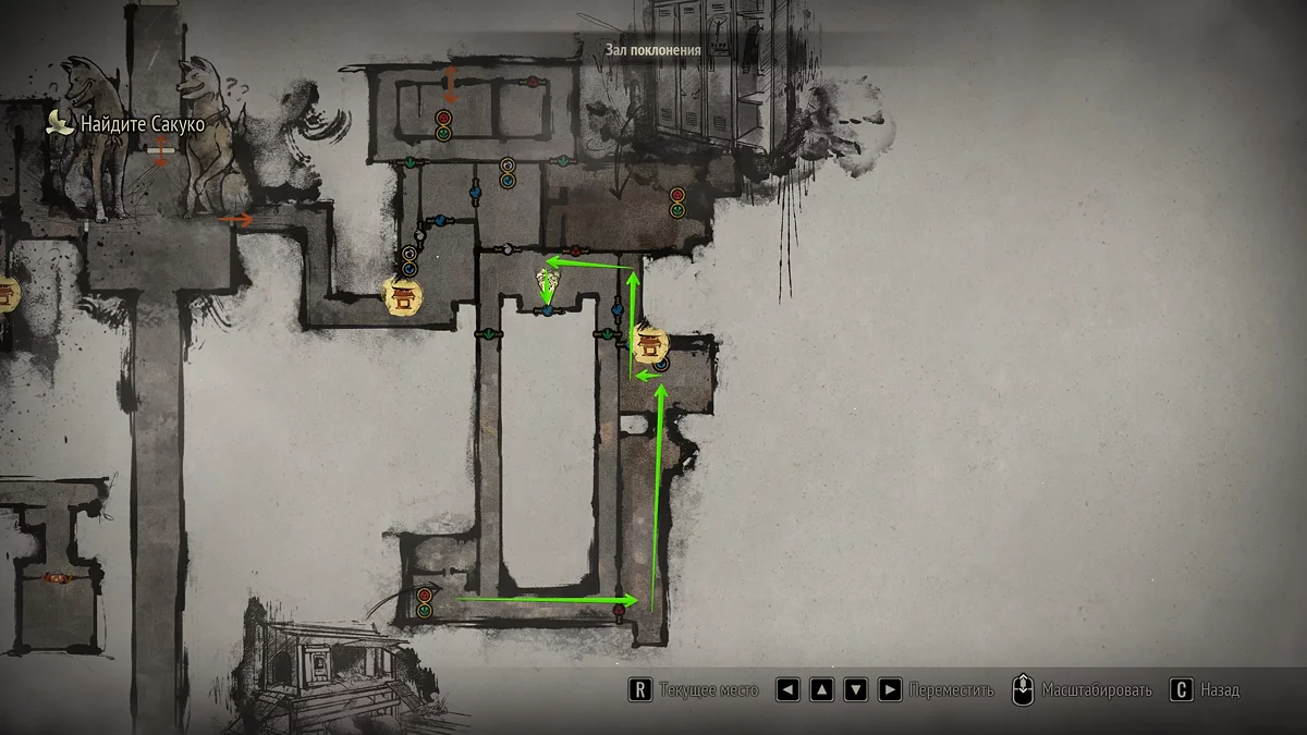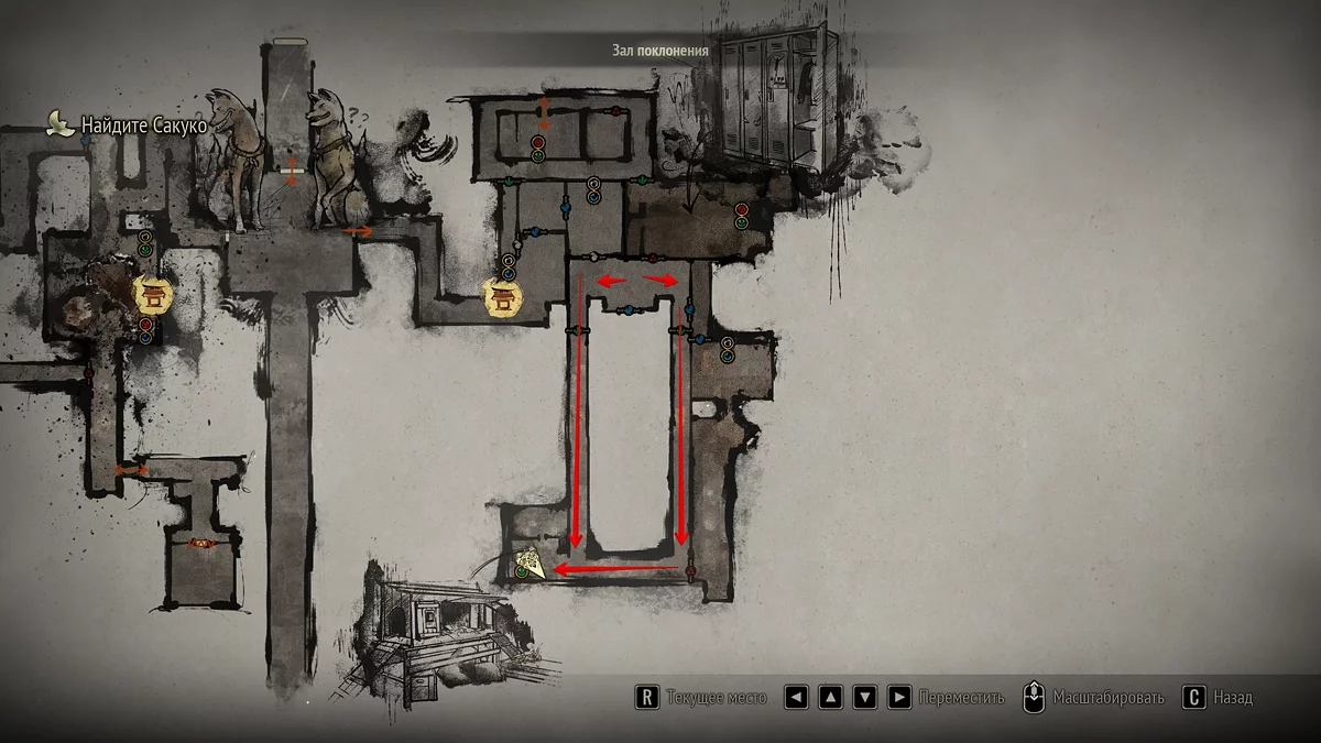 Пройдите через дверь напротив фрески и попадёте в комнату с монументами. Подойдите к ореолу из крови, создайте статую Инари в режиме концентрации и вытаскивайте стрелу из шеи. Выберите ширму, на которую укажет скульптура. Убейте в конце коридора гиганта и трёх мечниц. Заберите герб с белым воробьём и вернитесь в зал с росписью.