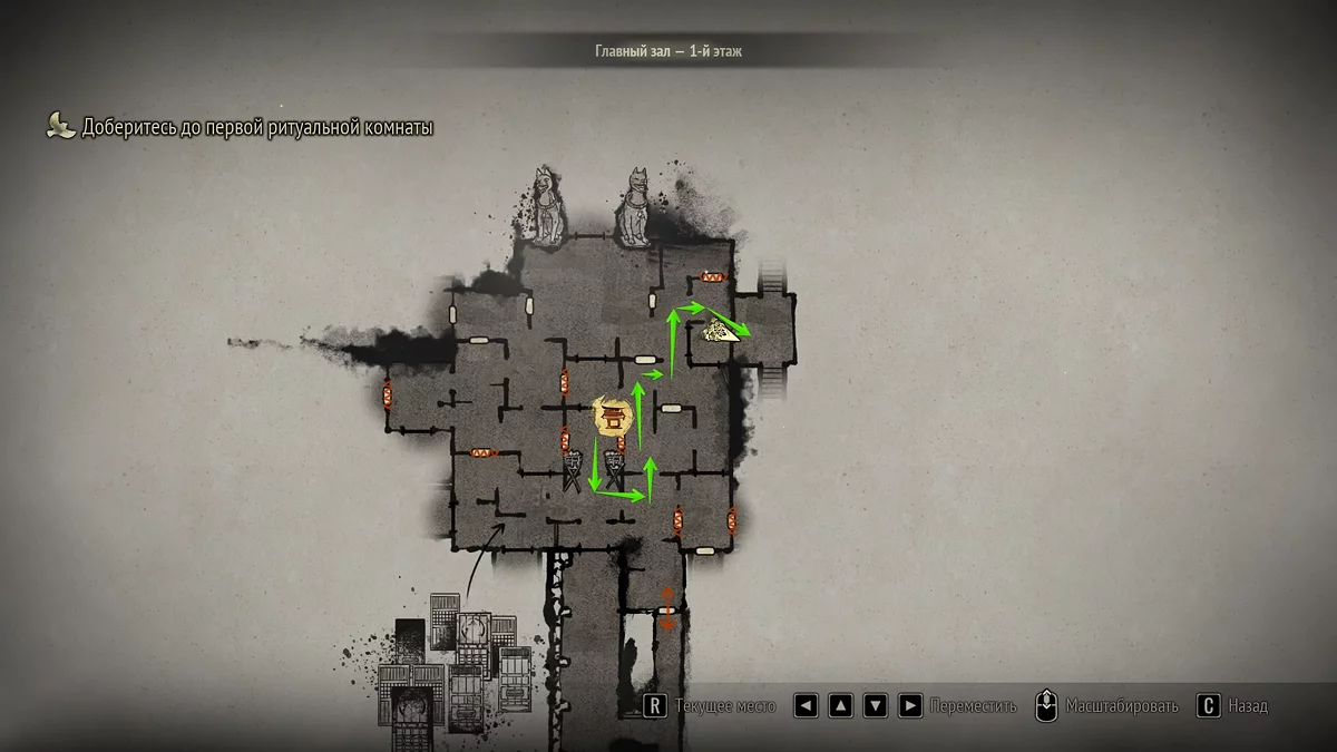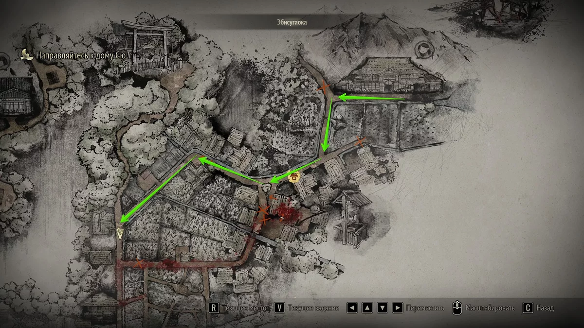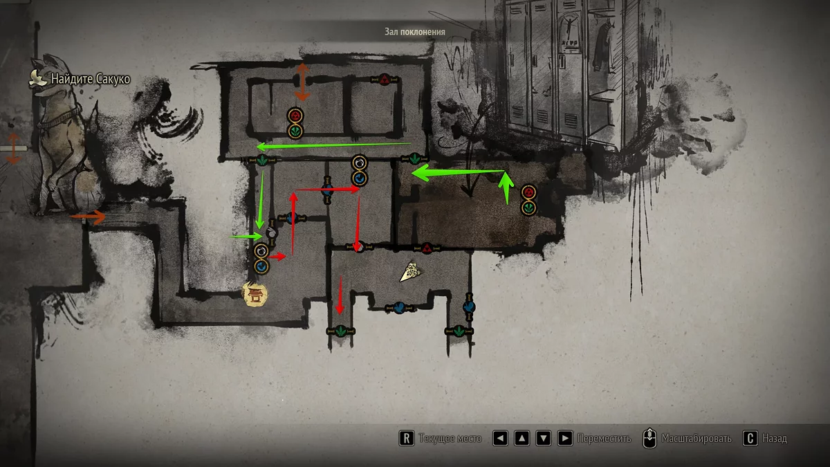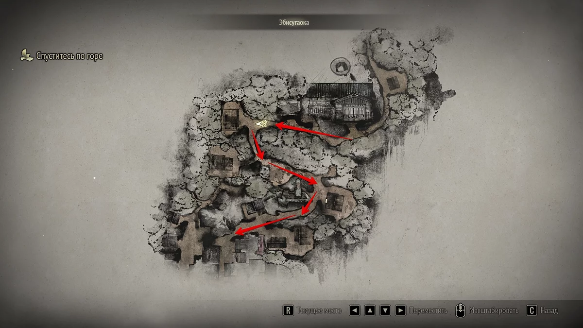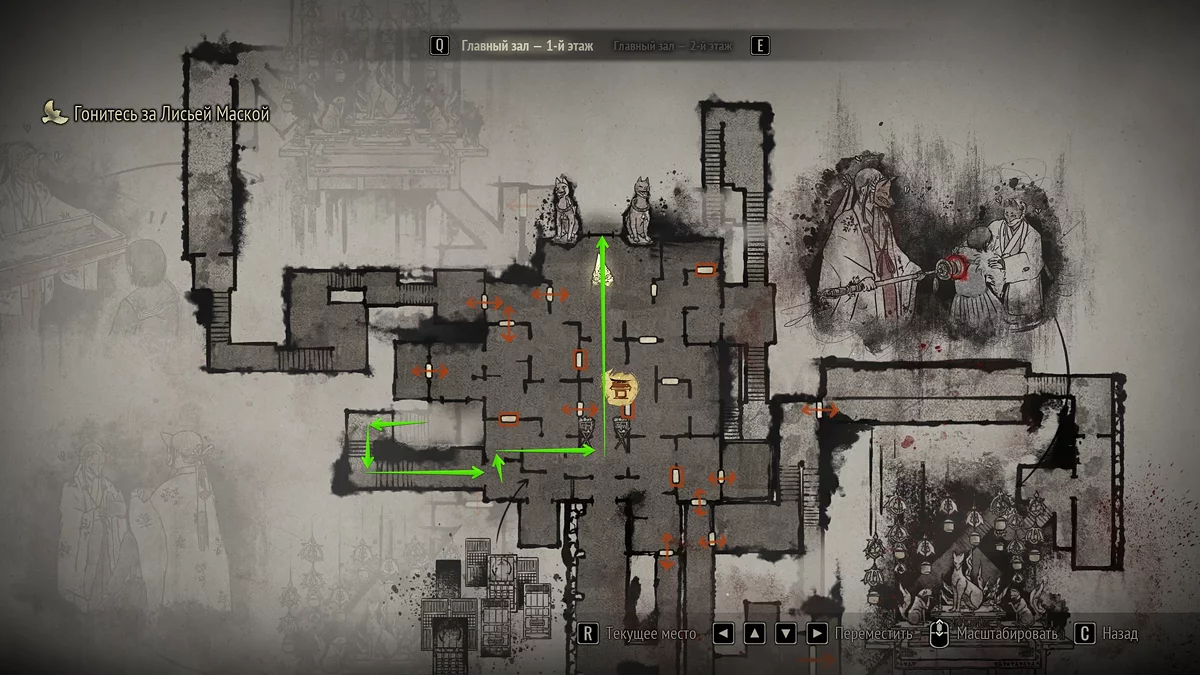 Войдите в дверь слева от росписи. Теперь откройте ширму у статуи лисицы слева и вытащите обломок стрелы. Пройдите до конца коридора и достаньте из коробки герб с черным воробьем. Теперь выйдете из комнаты с алтарем и перейдите в помещение справа. Уберите стену в режиме концентрации и пройдите через ворота справа в зал с фреской.