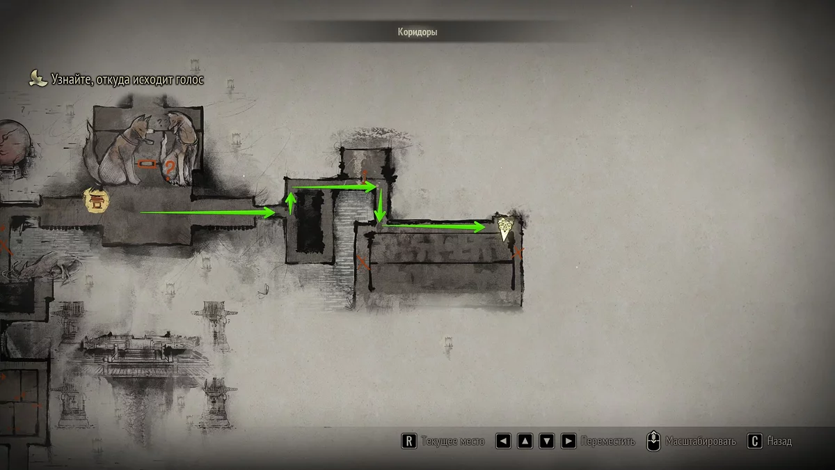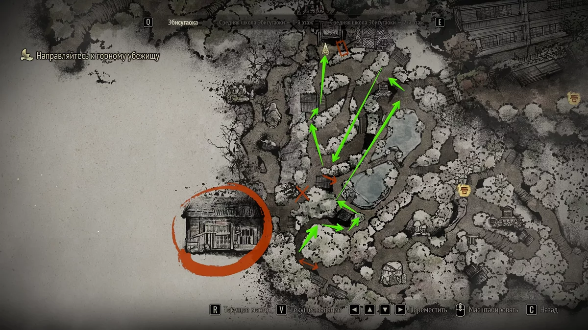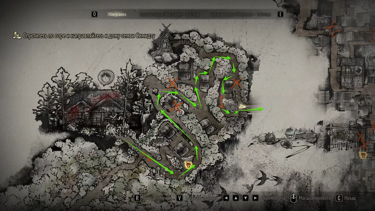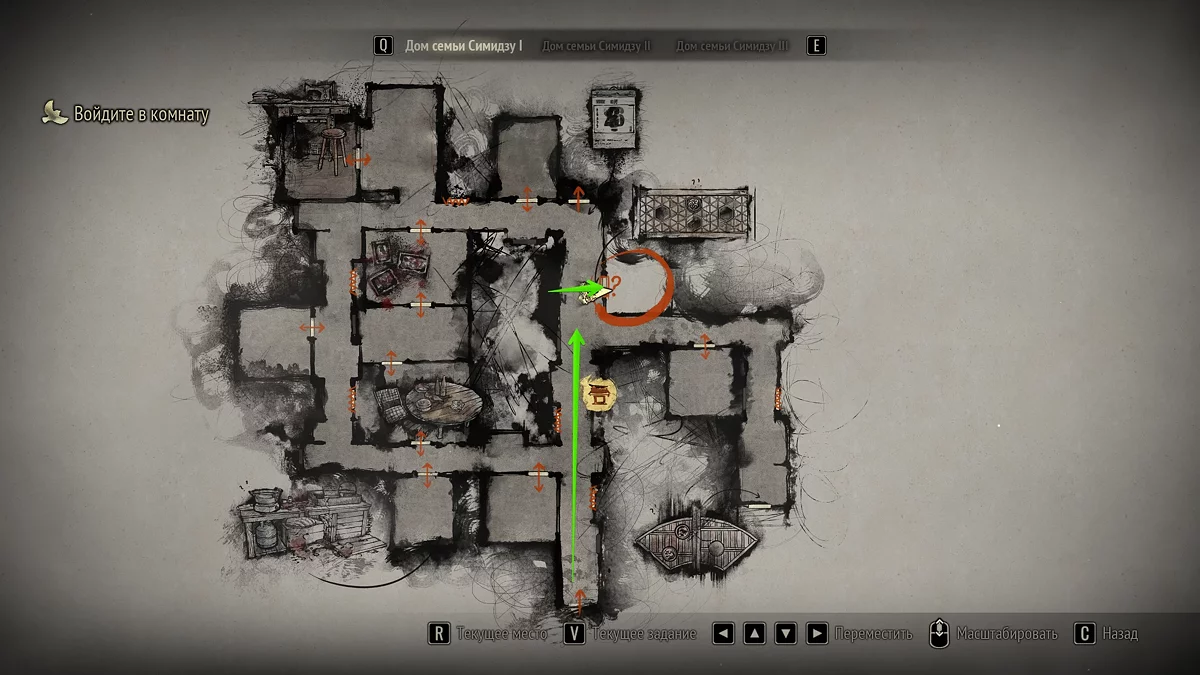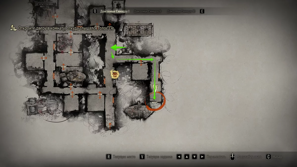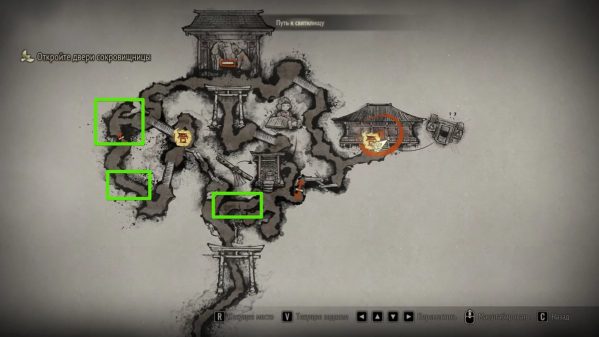 Войдите в дверь слева от росписи. Теперь откройте ширму у статуи лисицы слева и вытащите обломок стрелы. Пройдите до конца коридора и достаньте из коробки герб с черным воробьем. Теперь выйдете из комнаты с алтарем и перейдите в помещение справа. Уберите стену в режиме концентрации и пройдите через ворота справа в зал с фреской.