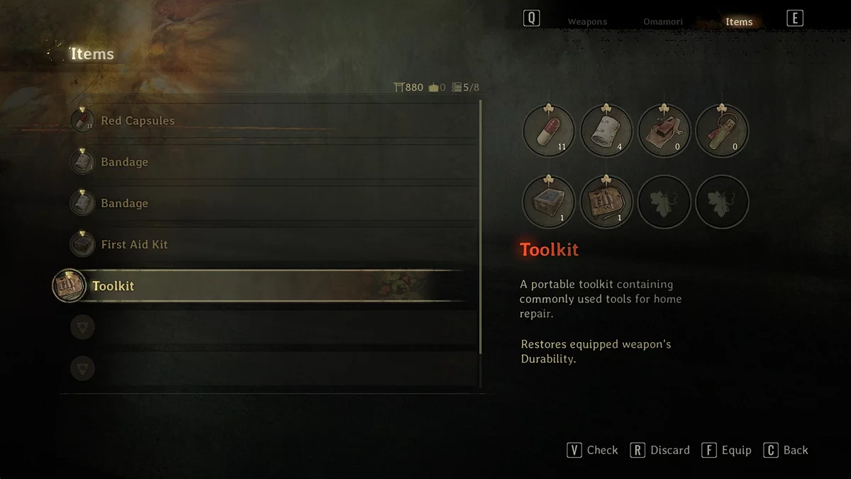 Набор инструментов (Toolkit) — восстанавливает прочность используемого оружия. Когда оно портится, ломается и пропадает из инвентаря. Поэтому старайтесь ремонтировать вооружение вовремя. Иначе рискуете оказаться в ситуации, когда посреди боя вы окажетесь безоружным.