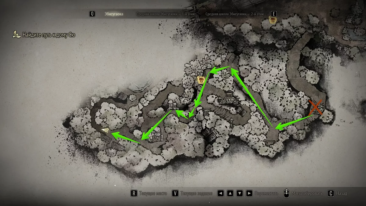 После короткой катсцены двигайтесь от грузовика налево, поверните направо и протиснитесь между домами. Пройдите по дворикам вперед и поговорите с Сакуко, которая будет ждать героиню у супермаркета. Выйдете из закоулка, поверните налево, следуйте по дороге прямо и перед огороженной ямой сверните направо.