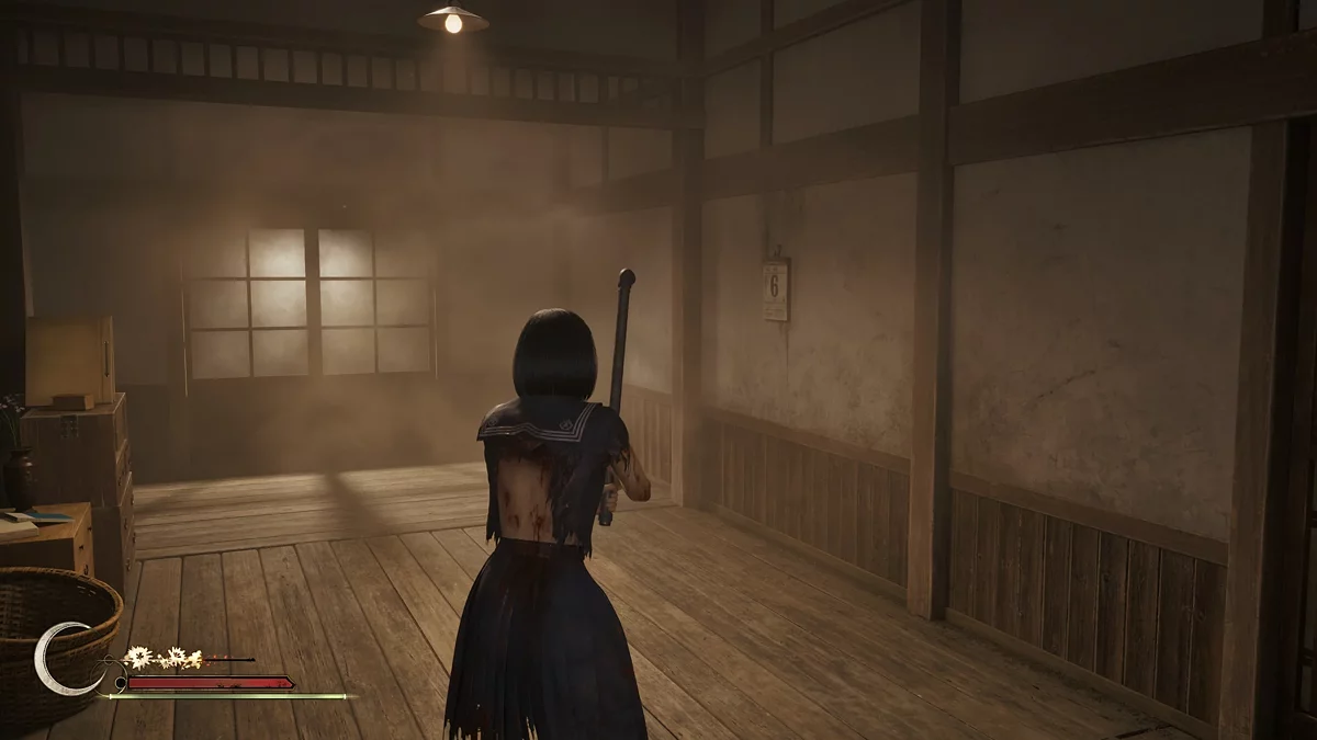 Чтобы убежать от чудовища, войдите в дом. Поднимитесь на второй этаж, откройте двустворчатую дверь, зайдите за угол слева. Посмотрите вниз и осмотрите маску, лежащую у сложенного матраса. Из неё героиня вытащит окровавленный ключ.