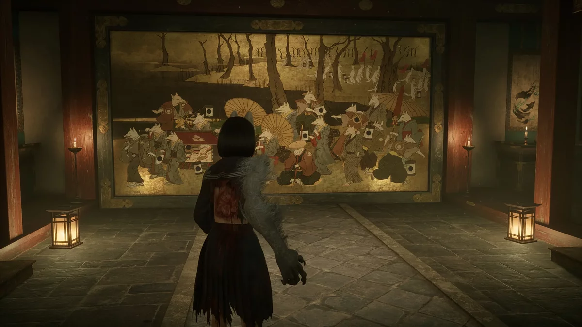 Хинако получит брошь, с помощью которой можно открыть двери и шкатулки с изображением лиса. Сейчас покиньте ритуальный зал и двигайтесь по коридору вперед, пока не наткнетесь на гигантскую расписанную стену.