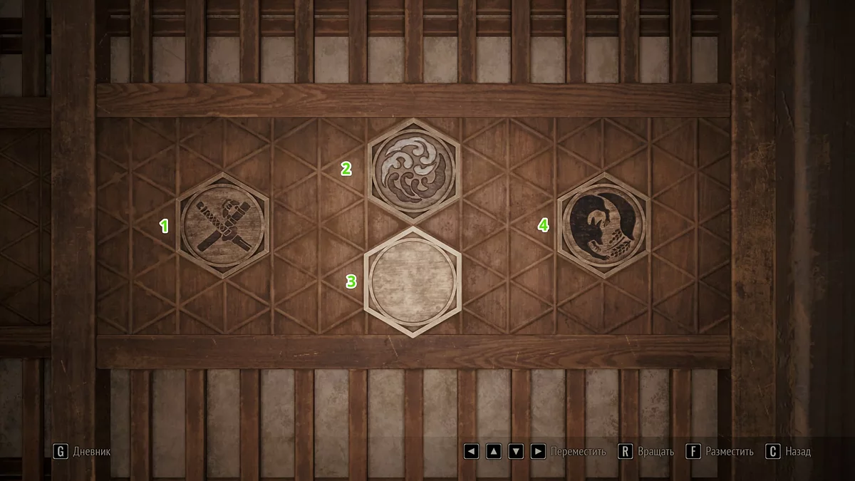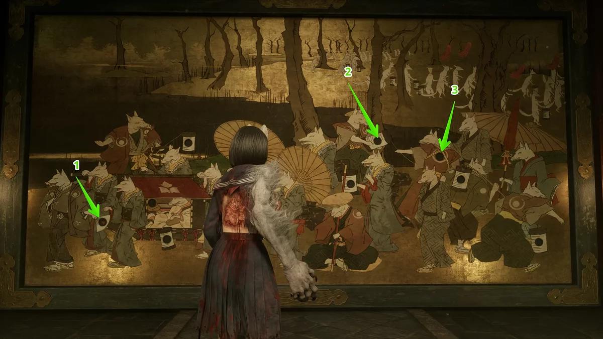 Для решения головоломки нужно найти три герба и вставить их в отверстия в росписи. Чтобы получить медальоны, необходимо из зала с фреской попасть в комнату со статуями Инари. Затем следует отыскать правильный монумент и вытащить из него обломок стрелы. После этого скульптура повернется к правильной двери. Если вы пройдёте через неправильную ширму, окажетесь в помещении с монстрами, которых придётся убить, чтобы вернуться обратно.