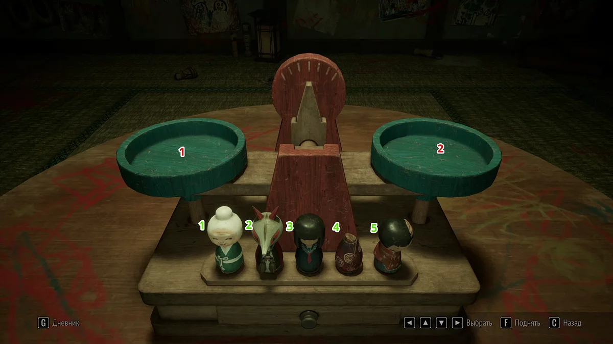 Подойдите к столику и увидите весы с пятью фигурками. На стене напротив двери висит записка: