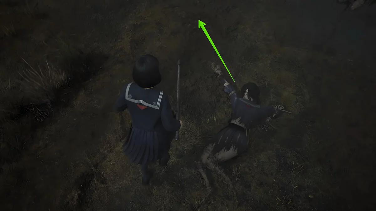 Среди манекенов на земле лежит пугало, которое своей рукой показывает направление. Таких будет ещё три, просто идите по указке тел, пока не наткнетесь на болванку, похожую на героиню.