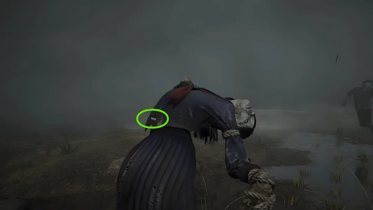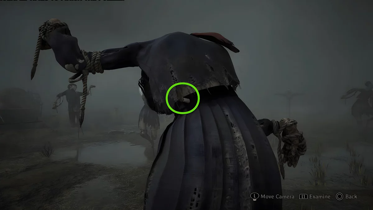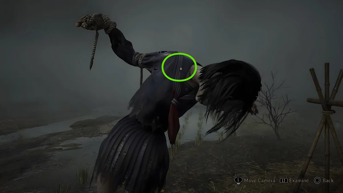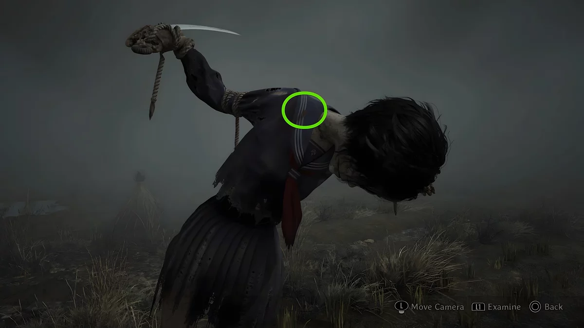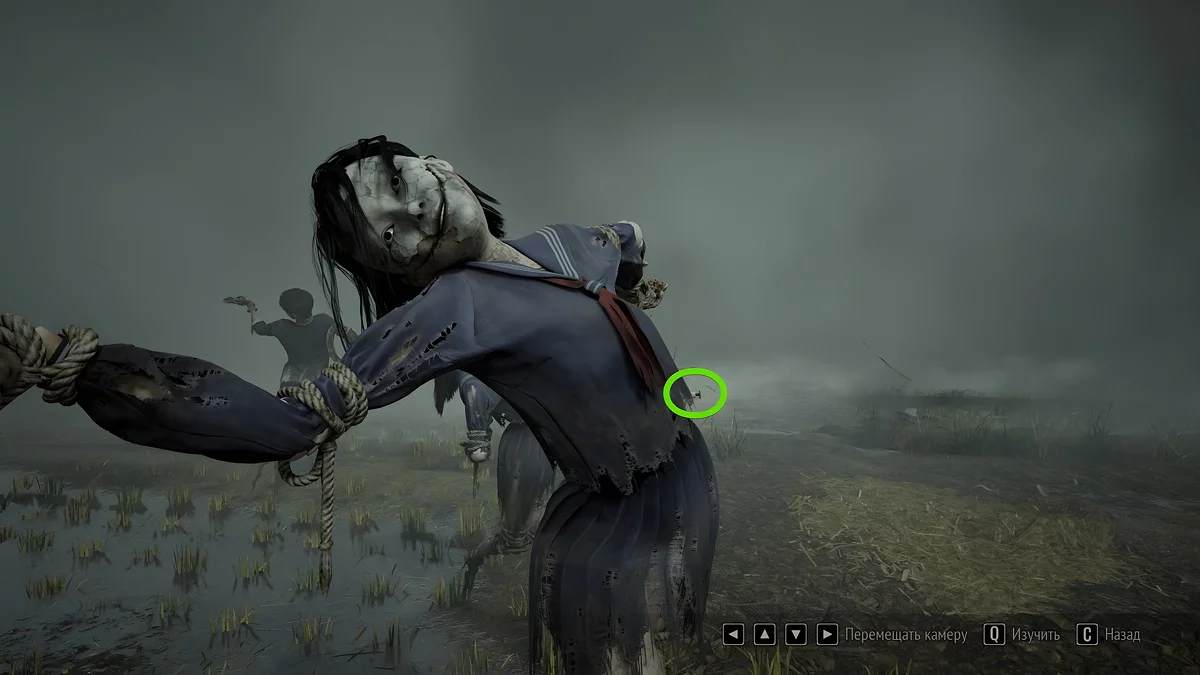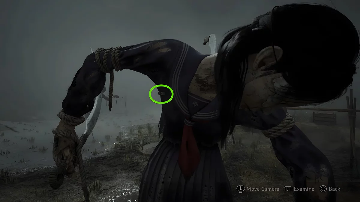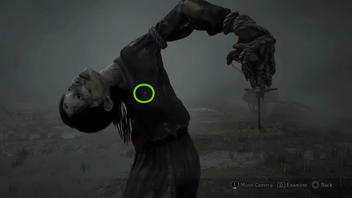 Подберите рядом с куклой тетрадь. Дальше нужно прочитать записку на пугале с белым мешком на голове и вытащить из правильной куклы флеш-карточку пять раз подряд. В случае ошибки манекен нападёт на героиню, то же самое произойдёт, если будете медлить.