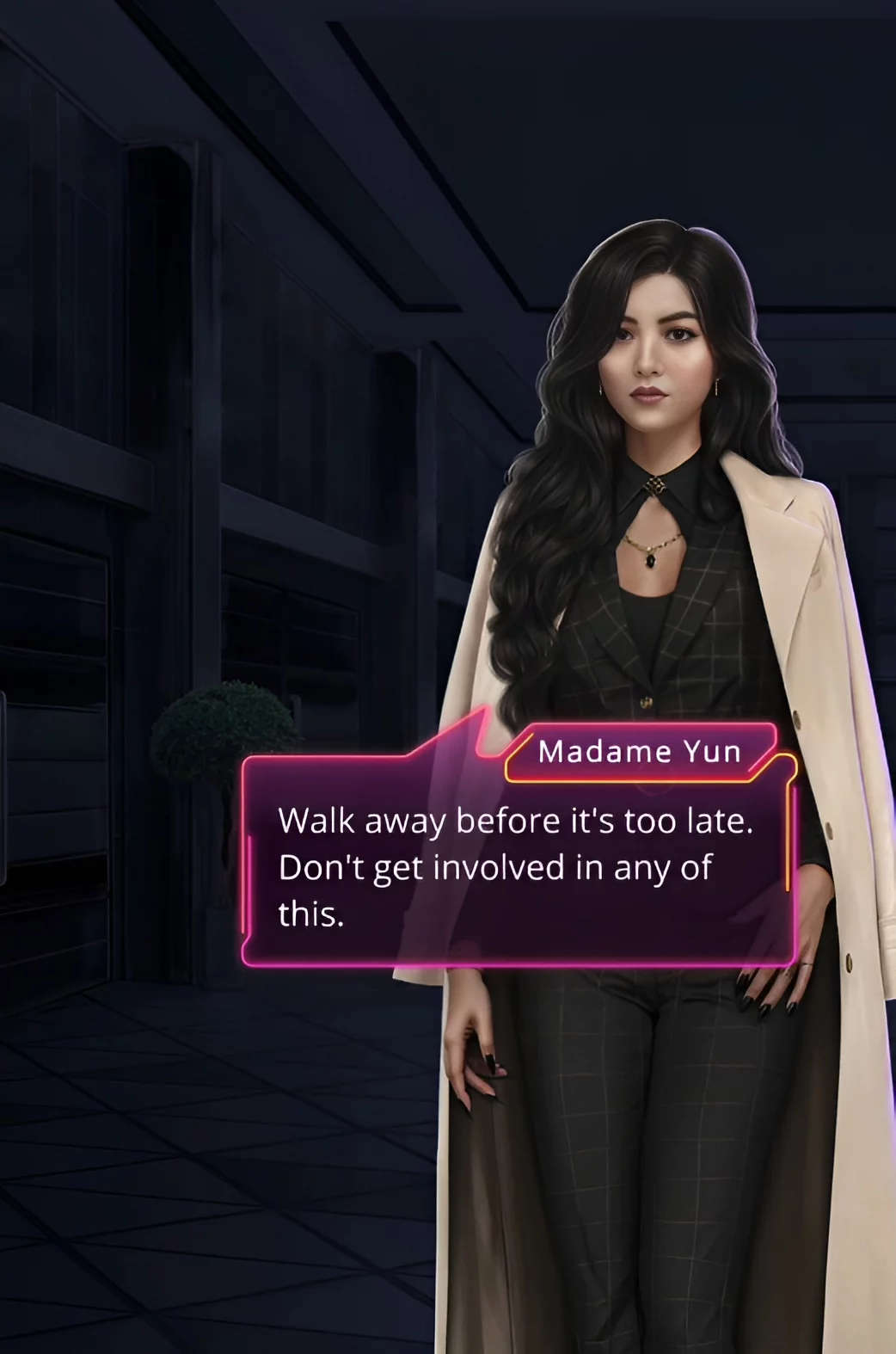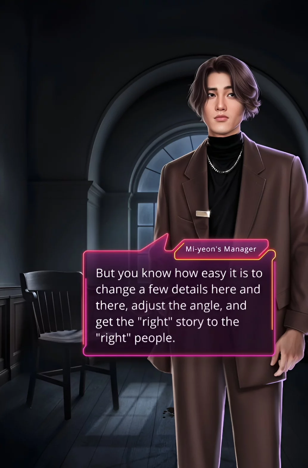Вы попыталась выбраться, но господин Нам схватил за горло. Когда его пальцы разжались, послышался крик Дина, который просил бежать без оглядки. Ваша героиня рванула прочь со всех ног. Из клуба она попала в ресторан, где её встретил менеджер Миён. Мужчина заявил, что хочет поговорить.