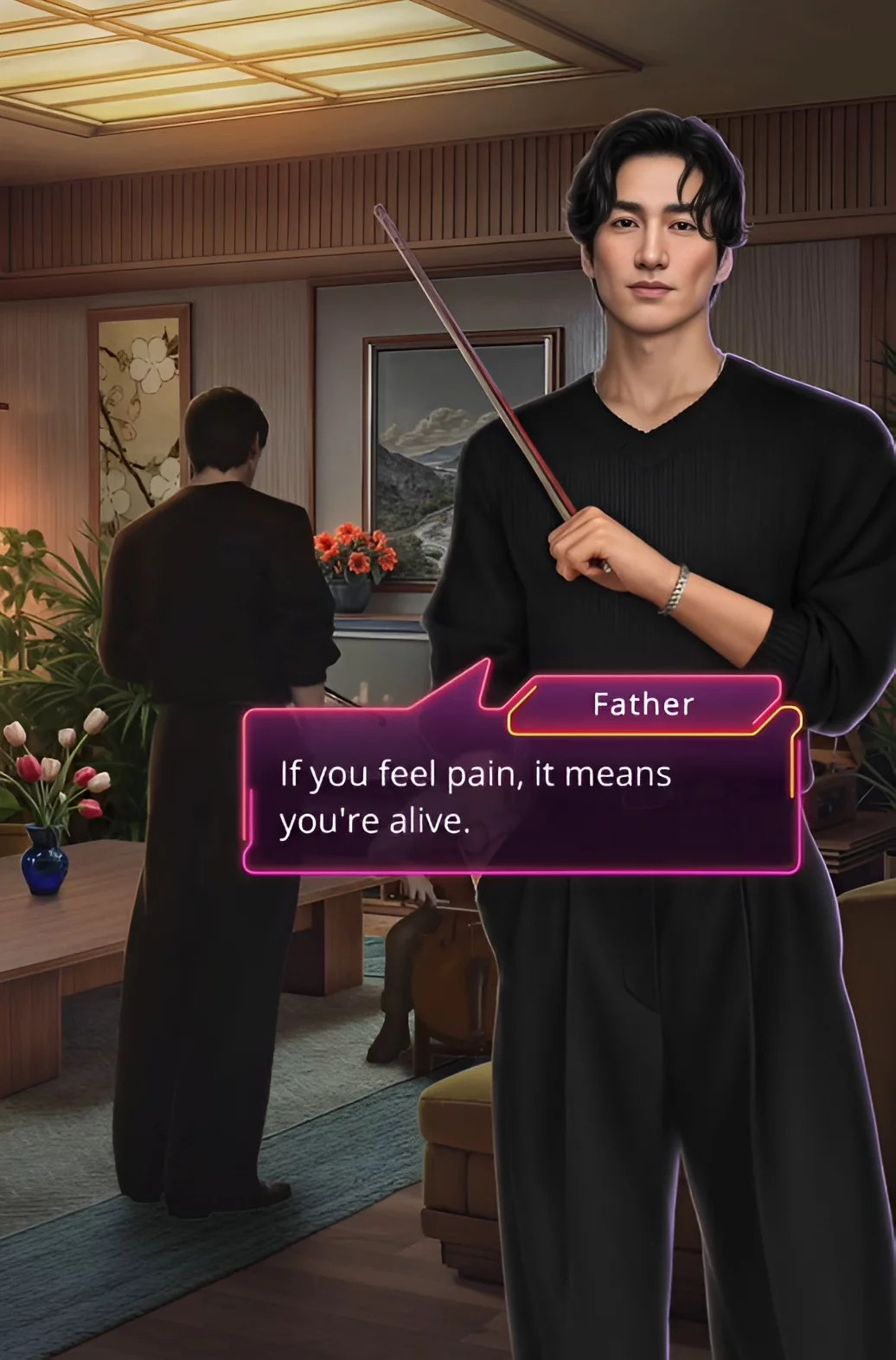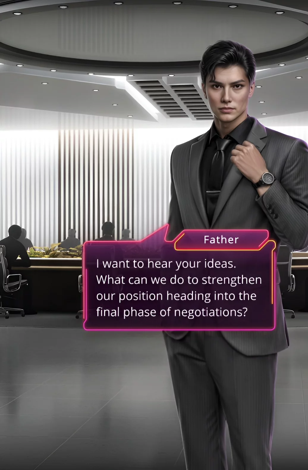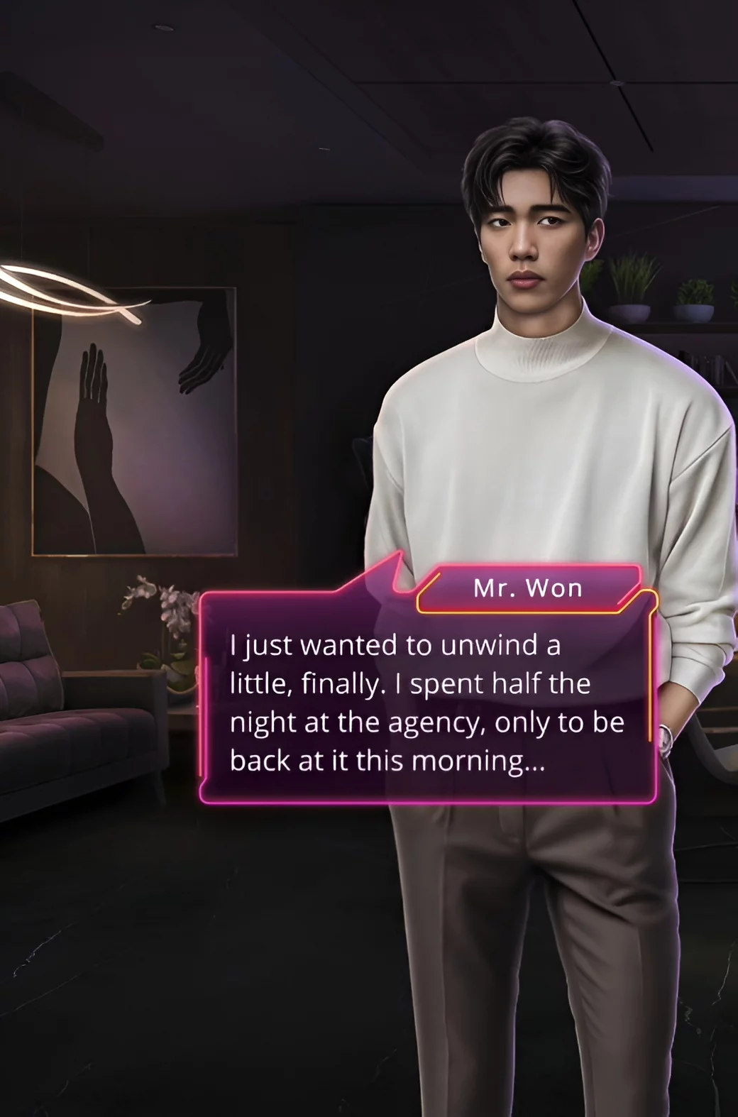 Играем за Минхёка. В зале заседаний отец поэта проводил совещание с менеджерами и спонсорами. Должна состояться важная сделка, поэтому необходимо укрепить финансовое положение агентства. Но парня волновал лишь телефон, ведь на связи была главная героиня этой истории. Отцу не понравилось поведение наследника, поэтому он поинтересовался мнением Минхёка об этой ситуации? Услышав общие фразы, мужчина спросил, что его отвлекает.