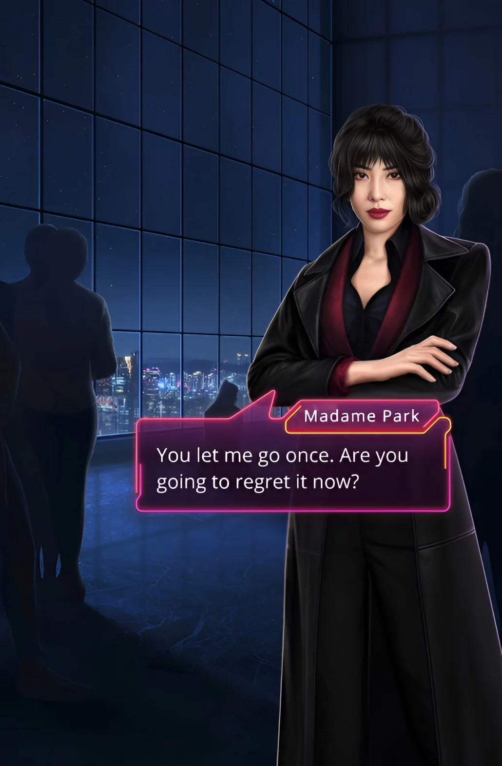 Господин Нам явно чувствовал себя хозяином положения. В клубе уже пошли слухи о его влиянии на вашу героиню. Он предложил сесть за стул рядом с ним. В качестве демонстрации своей власти мужчина потребовал, чтобы вы улыбнулись. Пришлось подчиниться.