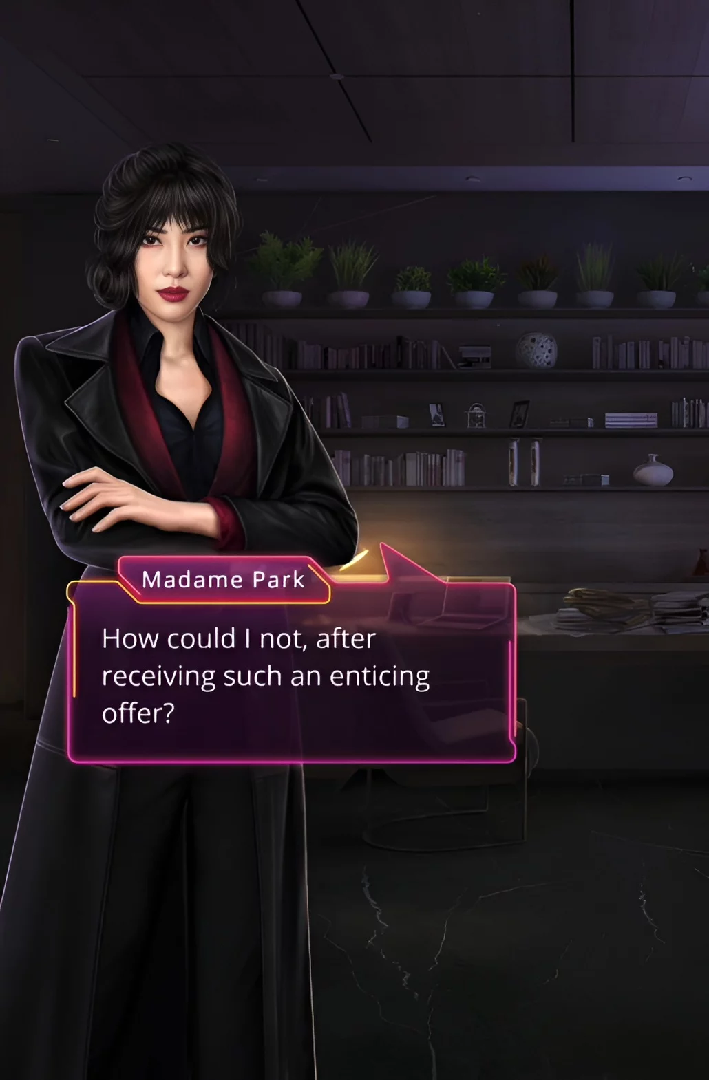 Играем за госпожу Пак. После окончания рабочего дня женщина решила зайти к господину Вону. Она решила притвориться, что согласна на его предложение, чтобы подобраться поближе и узнать ценную информацию. В частности, пытались узнать цифры, даты и другие сведения, которые могут быть паролем от компьютера. Девушка-менеджер даже попыталась очаровать своего коллегу. И мужчине это явно нравилось.