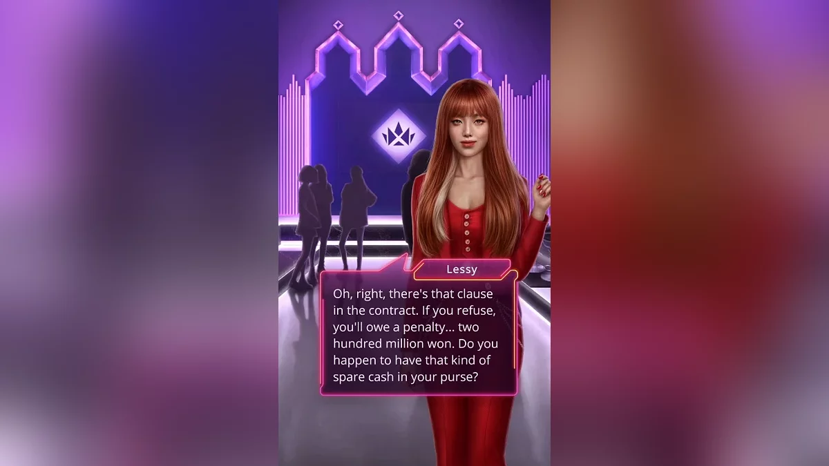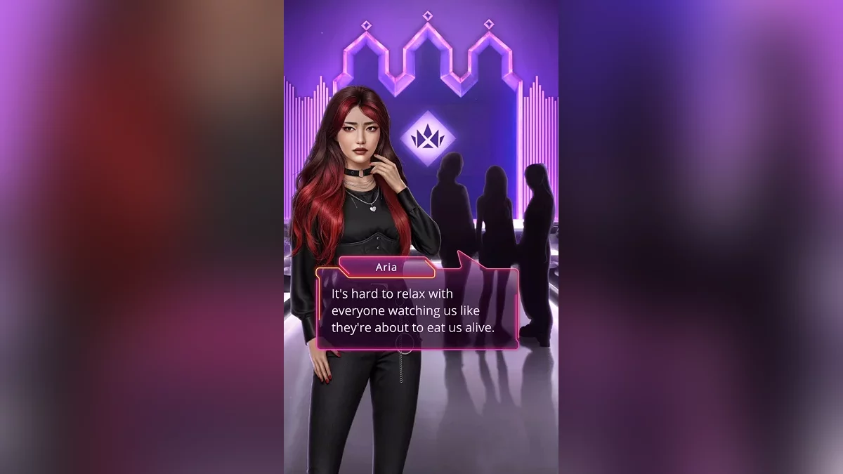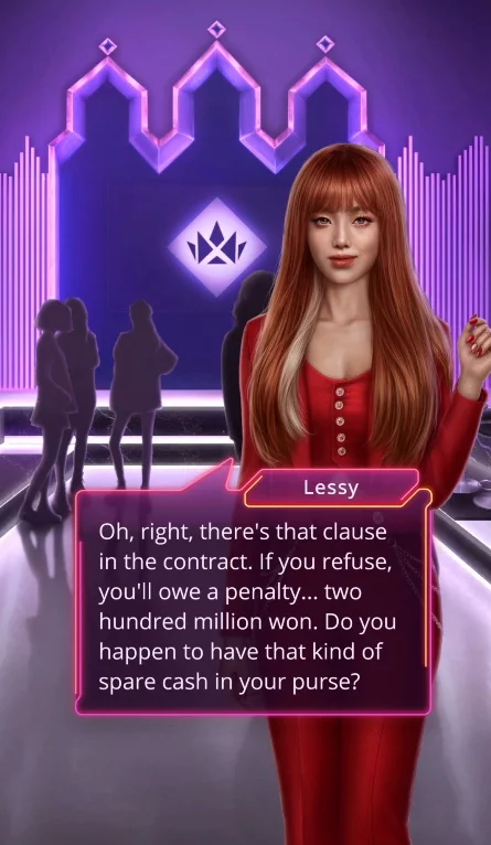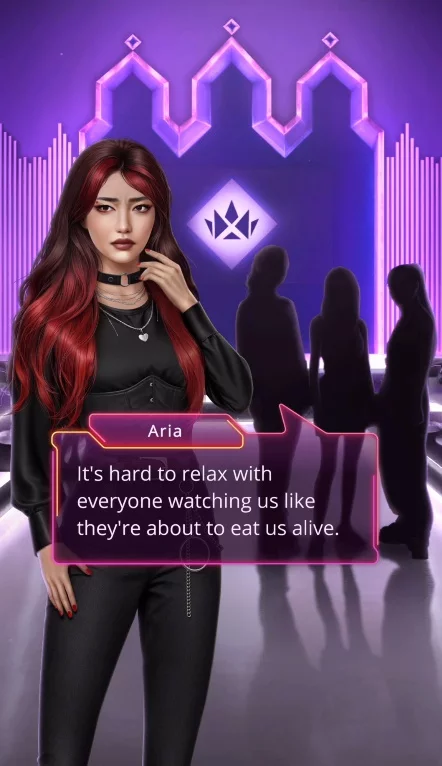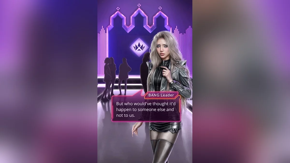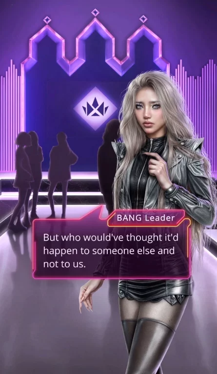 Начался очередной этап шоу, где группы соревнуются друг с другом. Главный приз — репутация и популярность. Как и другие участницы, вы будете петь кавер. Минхёк сделал всё, чтобы он звучал свежо и оригинально, но при этом остался узнаваемым. Ария явно волнуется, а Ёна выглядит расслабленно. К вам подошла участница коллектива BANG и сказала, что ждёт вашего выступления. Она поинтересовалась, привыкла ли ваша героиня к роли лидера группы.