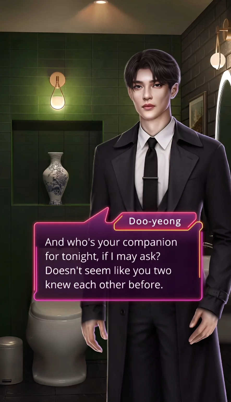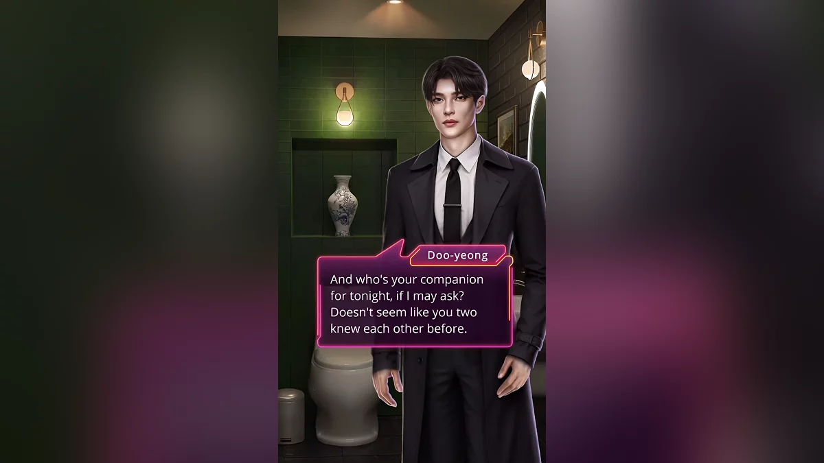 Вы видели и других знаменитостей, которые ужинают в компании с богатыми людьми. Среди них был Туён. Кивком головы он предложил вашей героине поговорить. В уборной удалось уединиться. Актёр начал отчитывать вас, но он и сам соврал о том, что не знает, как попасть в этот ресторан. По его словам, парень пришёл сюда, чтобы понять это место и какие опасности оно таит. Судя по всему, отец Туёна — частый гость здесь. Артист спросил, кем является ваш сегодняшний спутник.