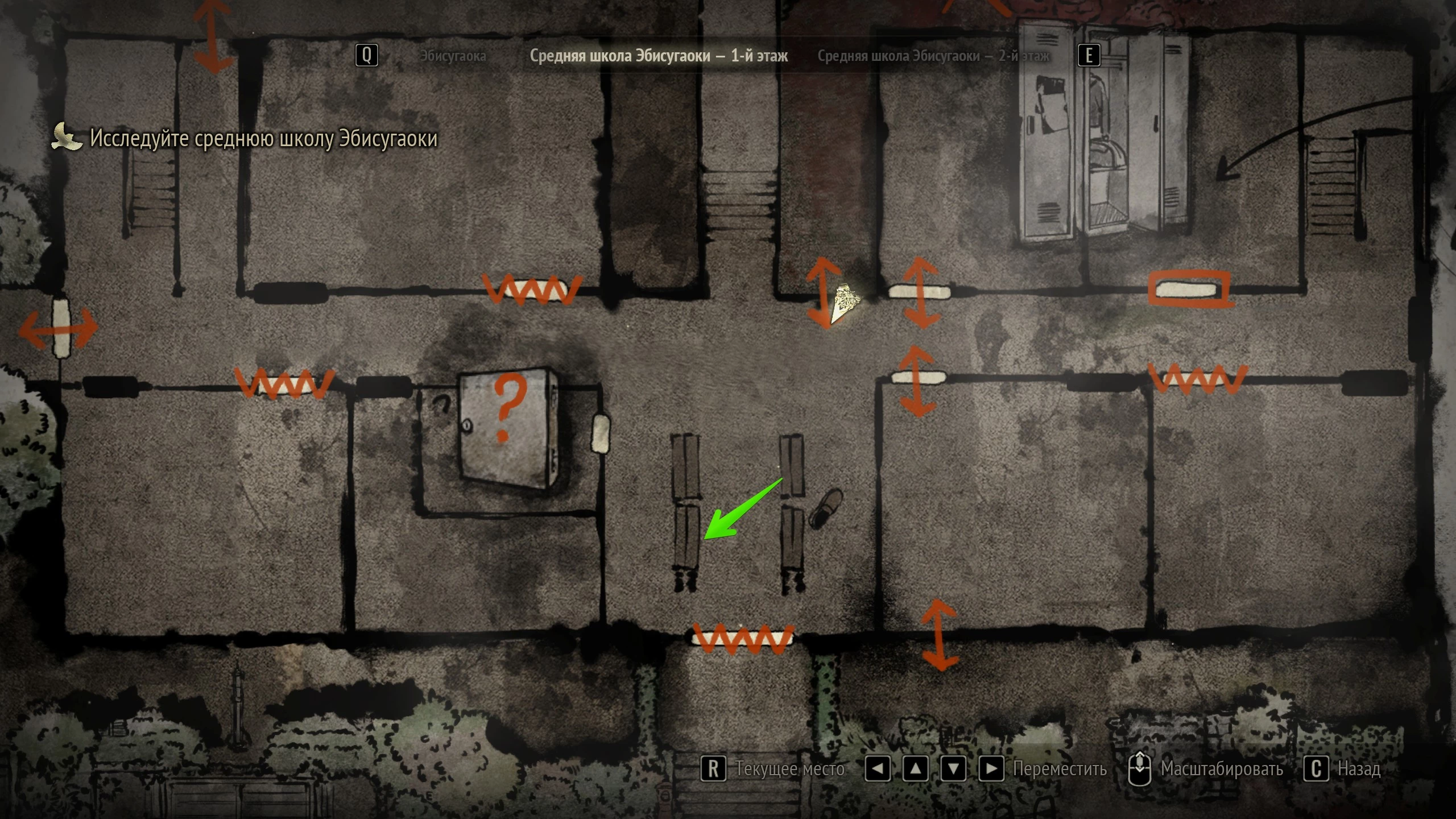 Второй этаж открывает для Хинако проход в аудиторию, где нужно решить загадку с деревянным ящиком. Чтобы туда попасть, нужно отыскать записку, прочесть её и найти ключ на заднем дворе школы. В зависимости от уровня сложности игры меняется расположение писем и текст в них, а также место появления ключа.