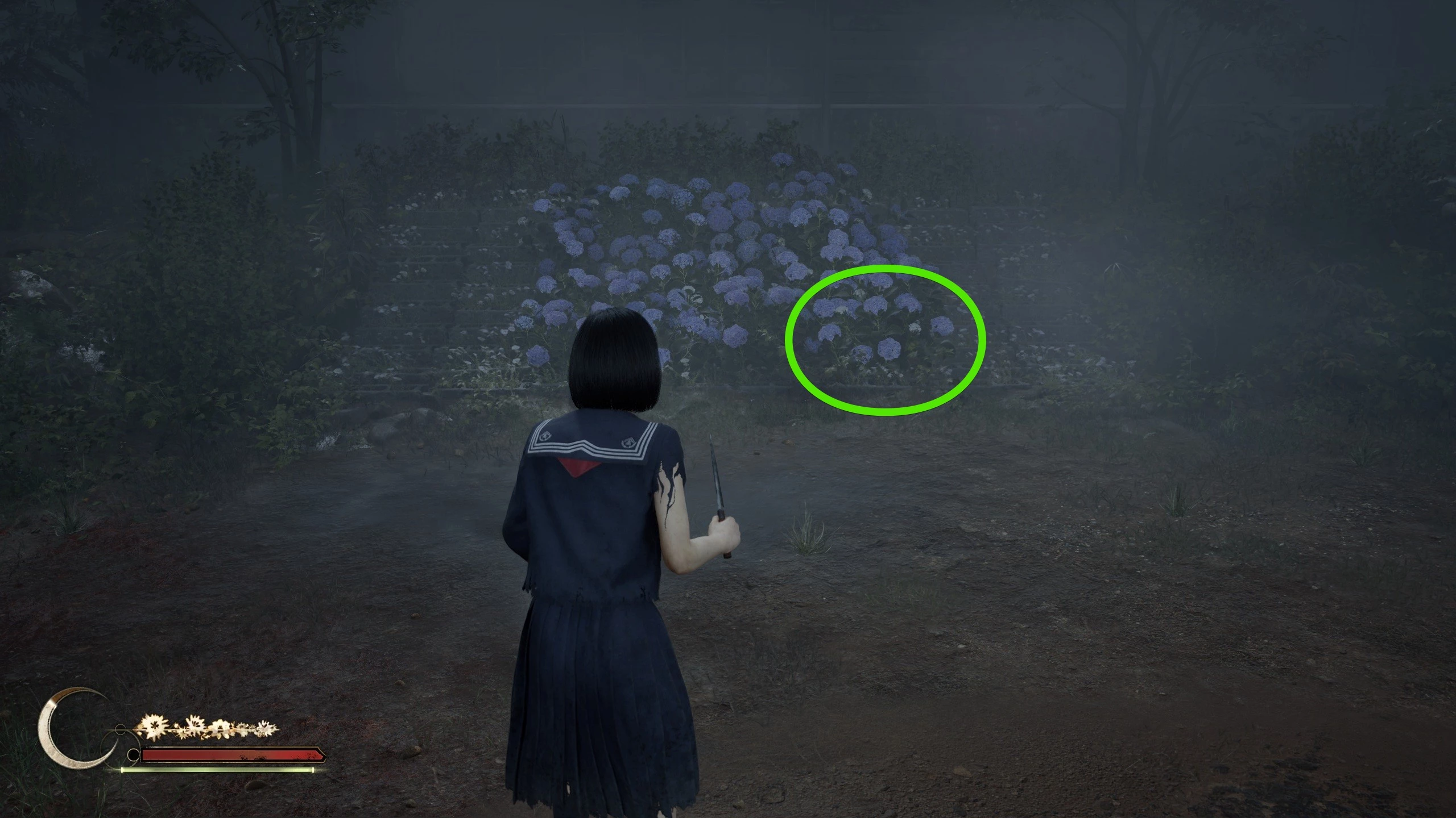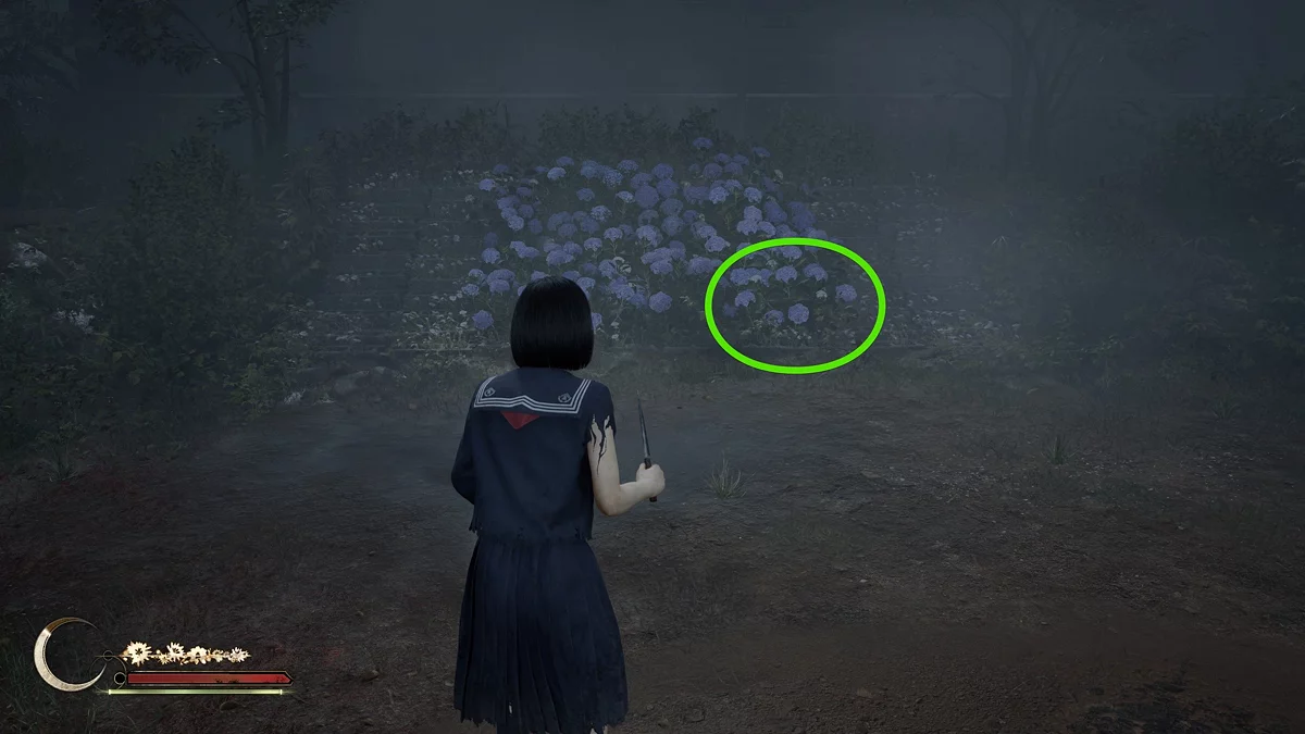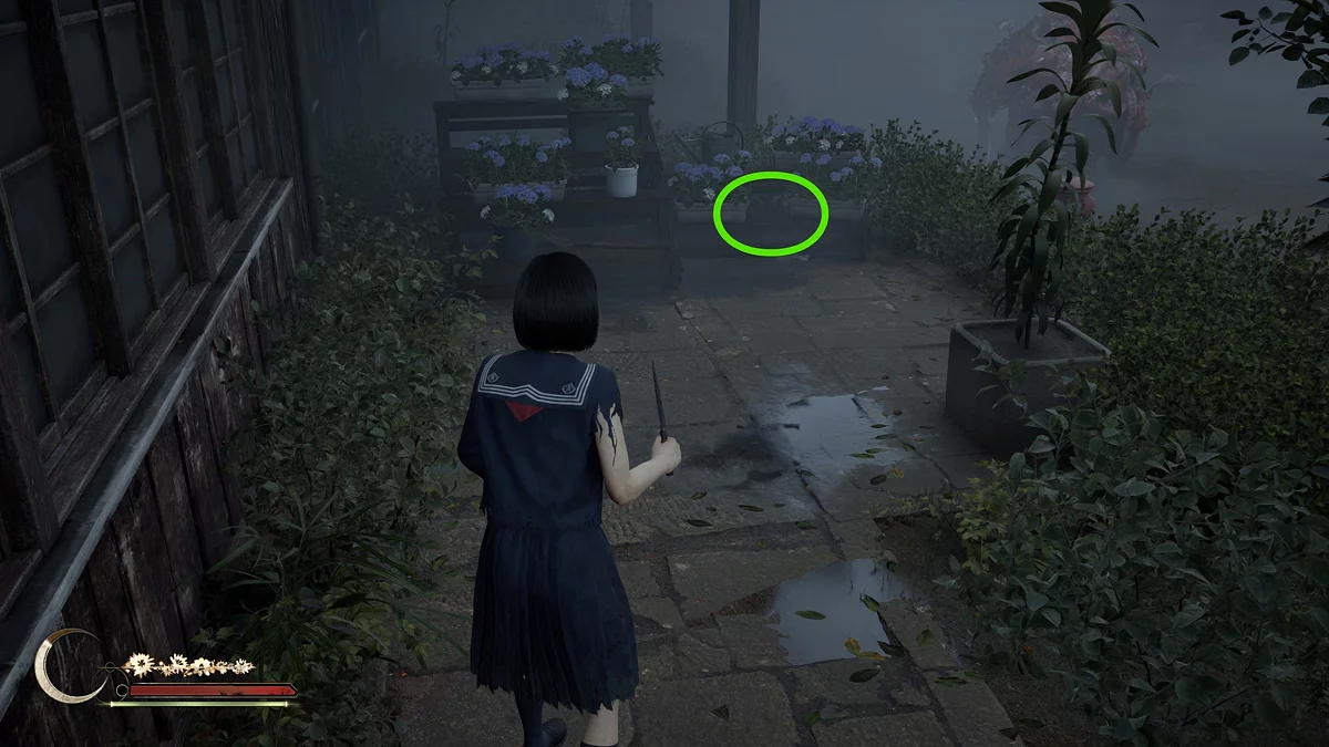 На фотографии из газеты Мацуо стоял с правой стороны клумбы. Соответственно, ключ от второго этажа нужно искать в нижнем правом углу. Поспешите, потому что по вашим следам идёт гигант. На обратном пути около лестницы появятся три мечницы. Рекомендуем не вступать в бой и убежать — через окно они перелезать не будут.