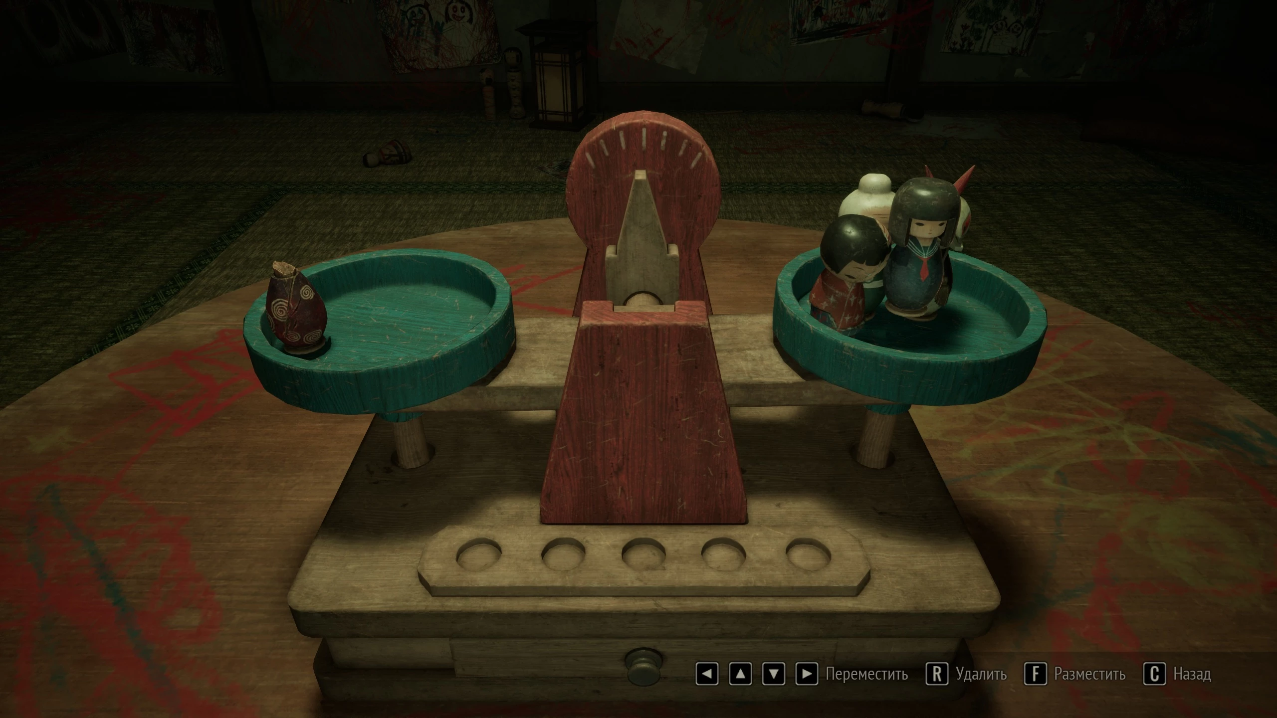 Расположение игрушек на чашах и текст с подсказкой меняется в зависимости от желаемой концовки, для которой нужно соблюсти определенные условия в процессе повторного прохождения игры. Поэтому далее мы опишем решение головоломки для всех финалов.