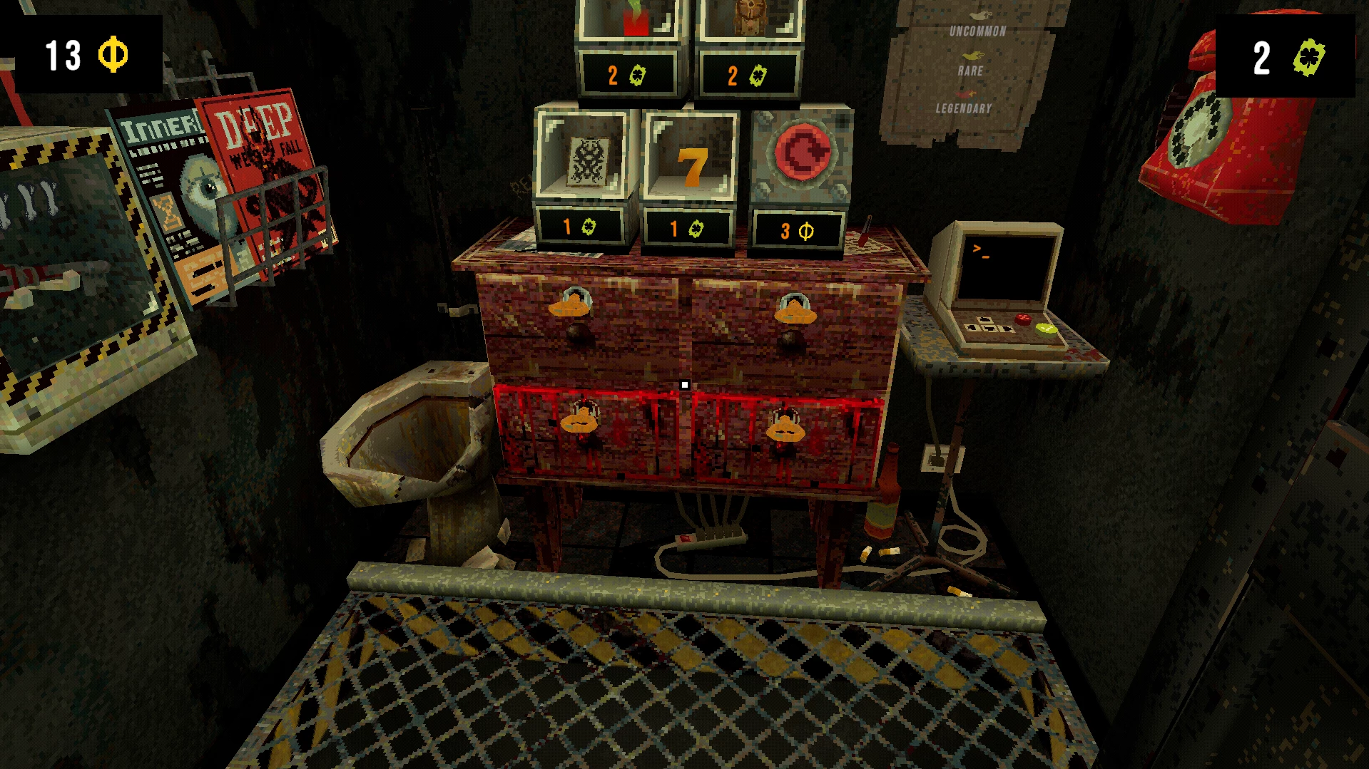 Перед получением концовок нужно выполнить несколько важных условий. Для начала убедитесь, что у вас открыты все ящики тумбочки, ведь вам понадобятся все части тел. Ящики тумбочек можно заработать, дойдя до крайнего срока. За один заход можно получить ключ всего от одного ящика, так что необходимо сделать как минимум три. Если перед началом забега вы хотите стартовать со всеми частями тела (кроме черепа, который может случайно появиться в магазине), убедитесь, что все ящики заполнены. В следующем заходе они преобразуются в недостающие части. Например, как показано ниже, при двух полностью заполненных полках вы начнёте игру с двумя частями из четырёх необходимых.