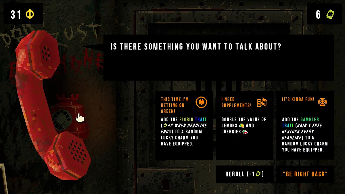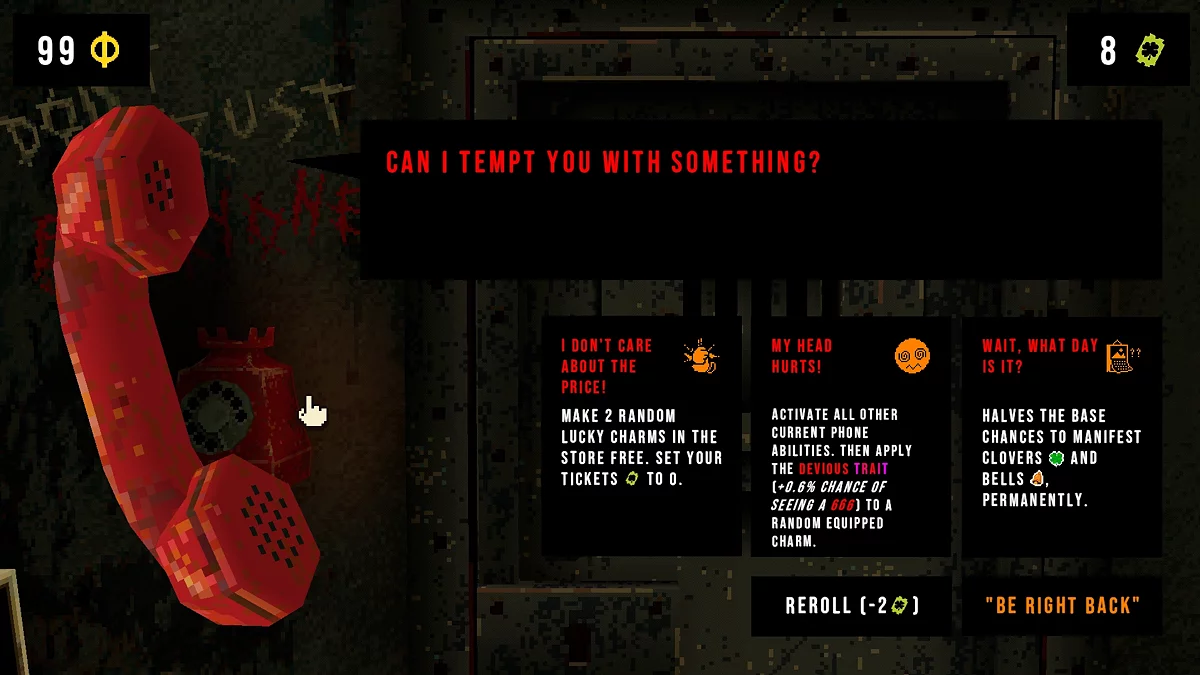 Если во время забега у вас хотя бы раз был звонок с красным текстом, на дискете «666» появится отметка. Нужно собрать три таких отметки, то есть получить ещё два «красных» звонка. Обычно за одну игру можно добиться двух, однако выполнение пункта 1 из условий гарантирует, что следующий звонок станет ключевым. Так можно собрать все три отметки. Важно: все условия необходимо выполнить за один забег, иначе после перезапуска прогресс сбросится. После получения трёх отметок телефон изменит внешний вид, а следующий звонок станет святым — он позволит получить священные чары. Ключ от двери также преобразится. Открыв дверь святым ключом, вы сможете увидеть истинную концовку игры.