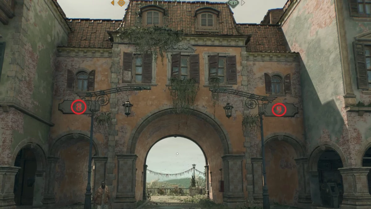 - Седьмой — поворачиваем налево в проход между зданиями, на нём и будет ещё один герб.
