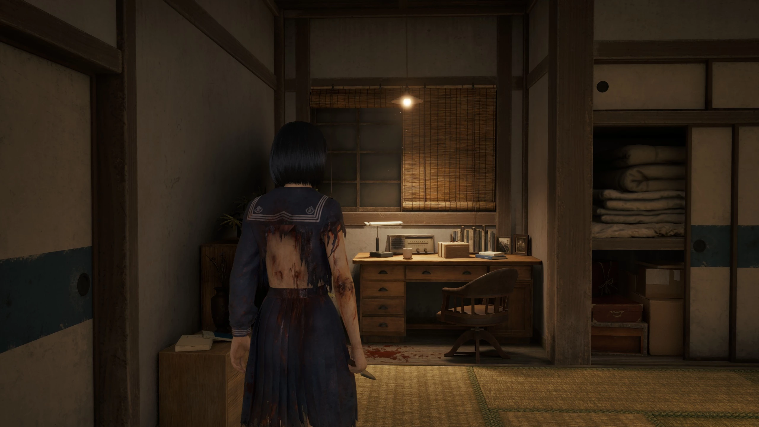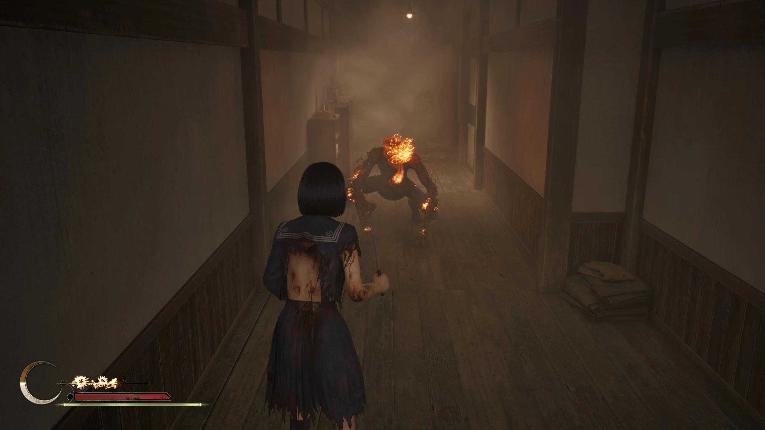 Сделайте первое сохранение у алтаря справа. Святилище дублируется на одном и том же месте во всех уровнях дома Симидзу. Далее на первом повороте уходите направо и двигайтесь в конец коридора.