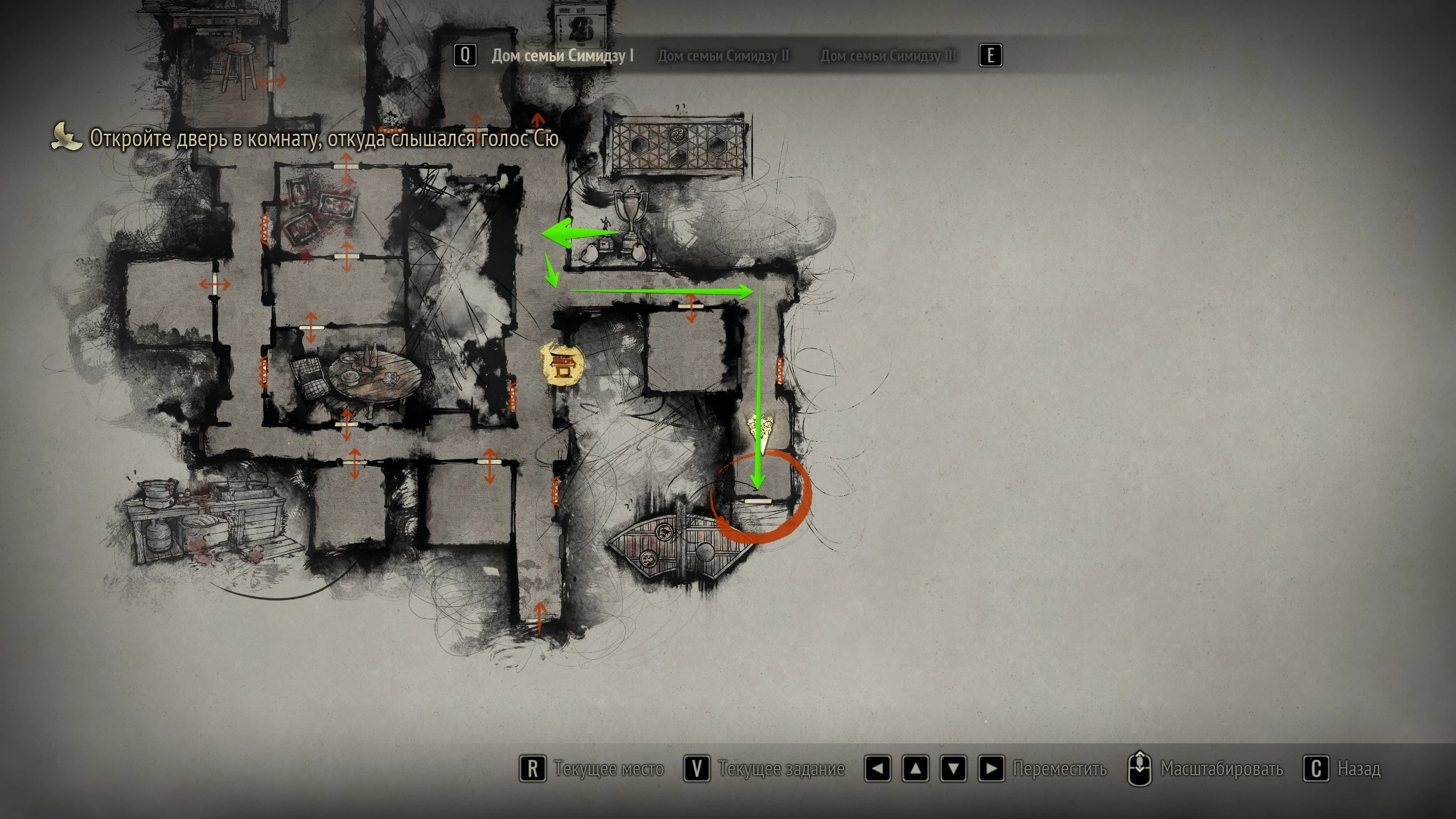 Главная задача в доме Симидзу — открыть дверь с веером на первом уровне в правом крыле. Для этого нужно открыть все секции, перебить всех монстров и решить четыре головоломки. Далее мы поэтапно опишем план действий с пояснением.