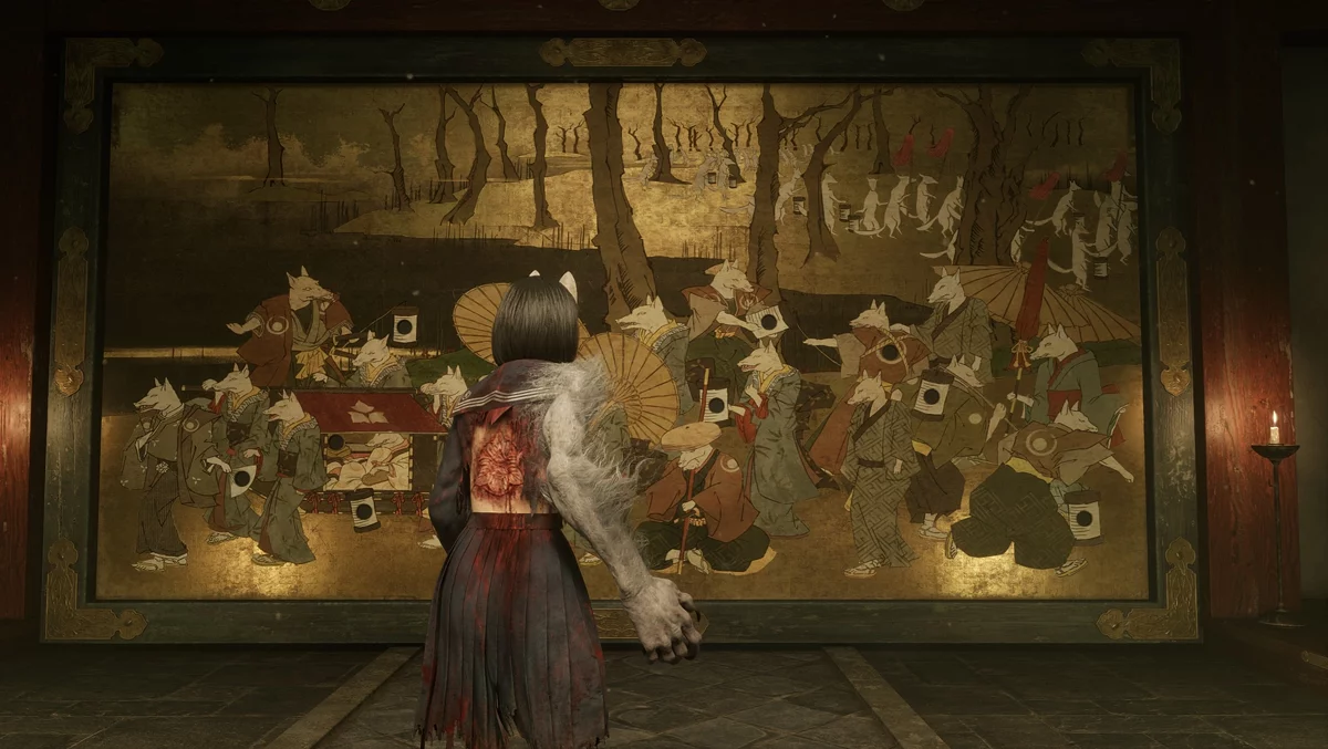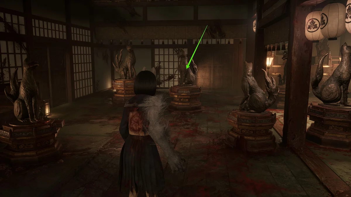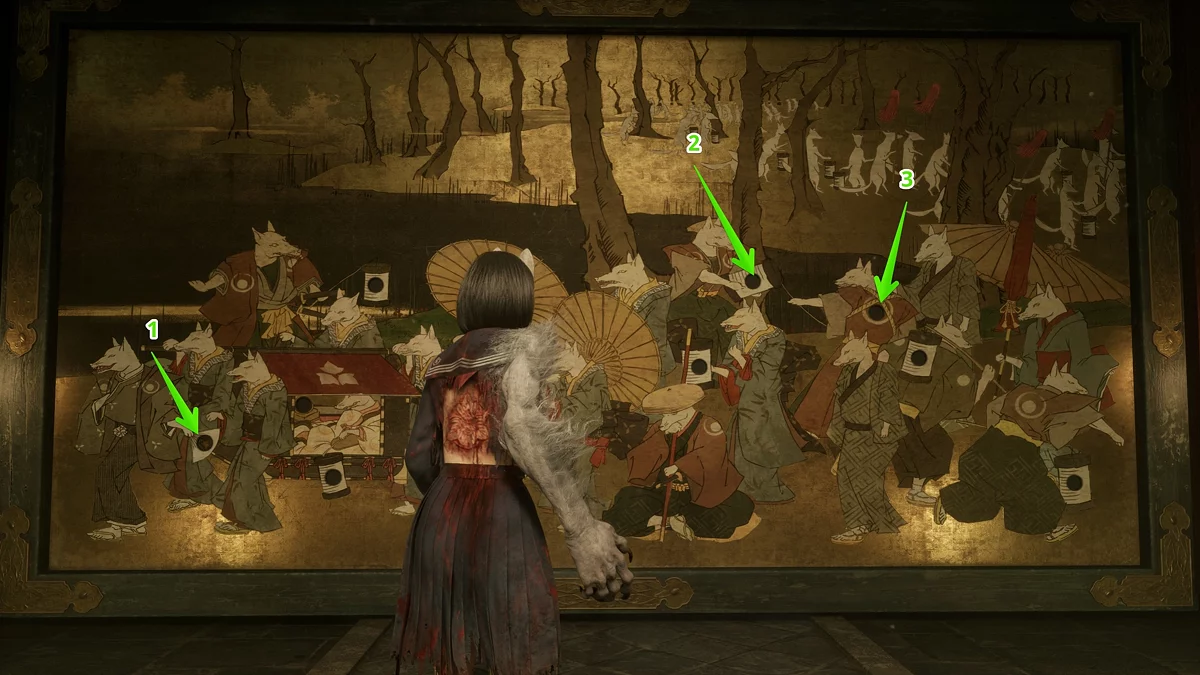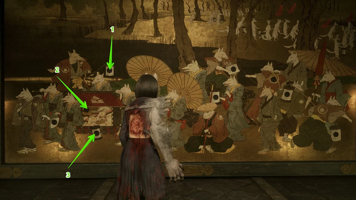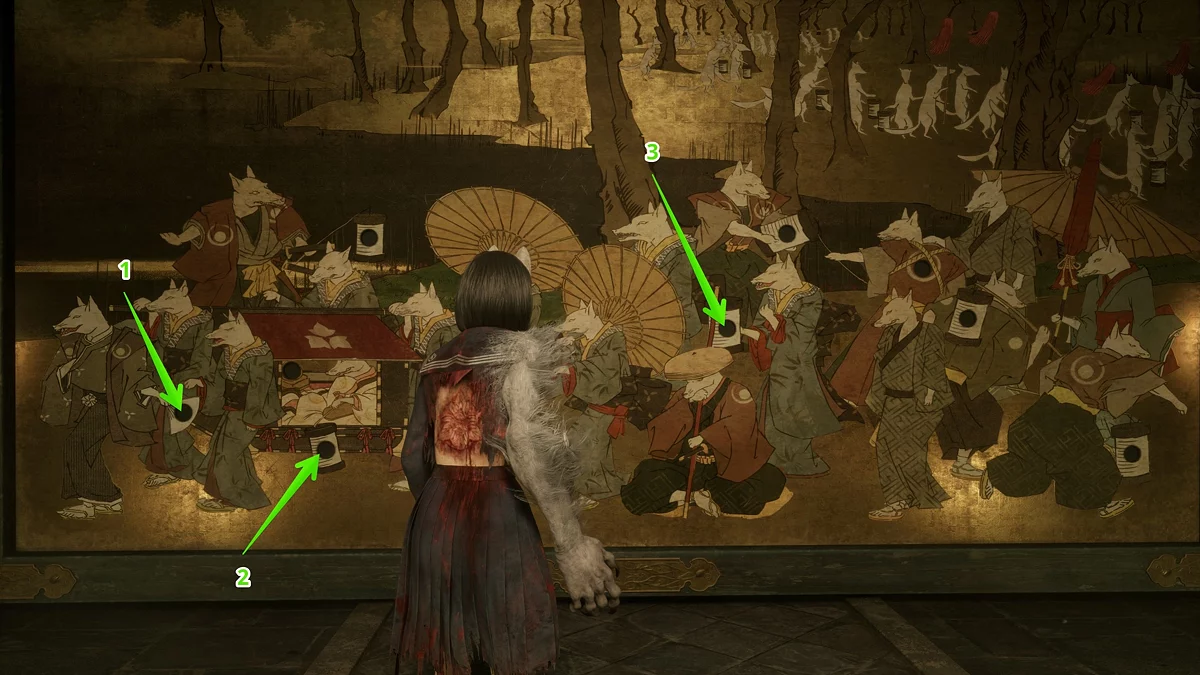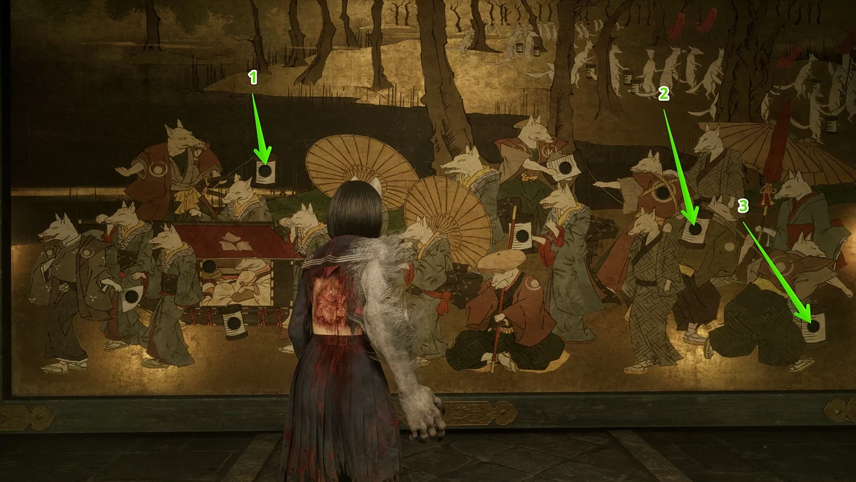 В комнате с фресками есть двери, которые открываются в определенной последовательности. Из зала с фреской героиня попадет в комнату со статуями Инари, в которой нужно отыскать правильную статую и вытащить наконечник стрелы. Затем скульптура поворачивается в сторону правильной ширмы, и у неё загораются глаза голубым светом.
