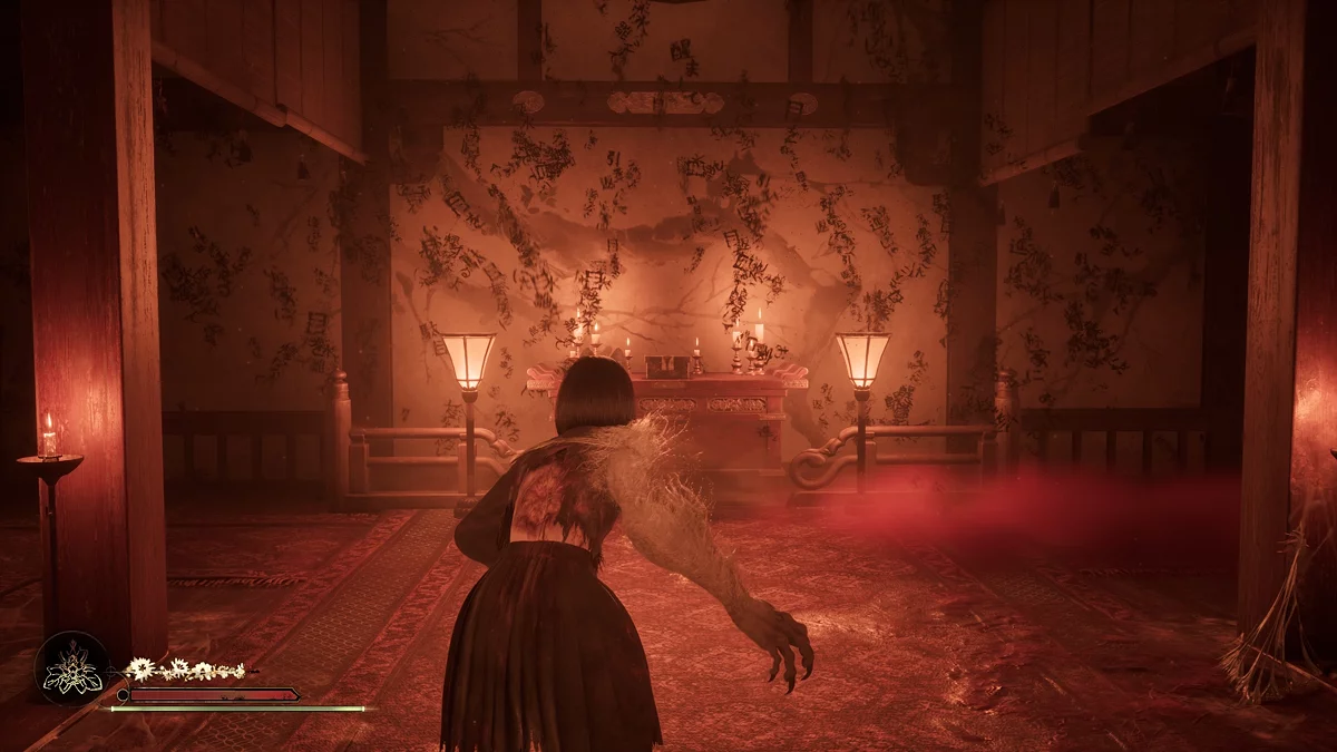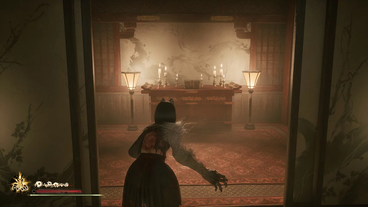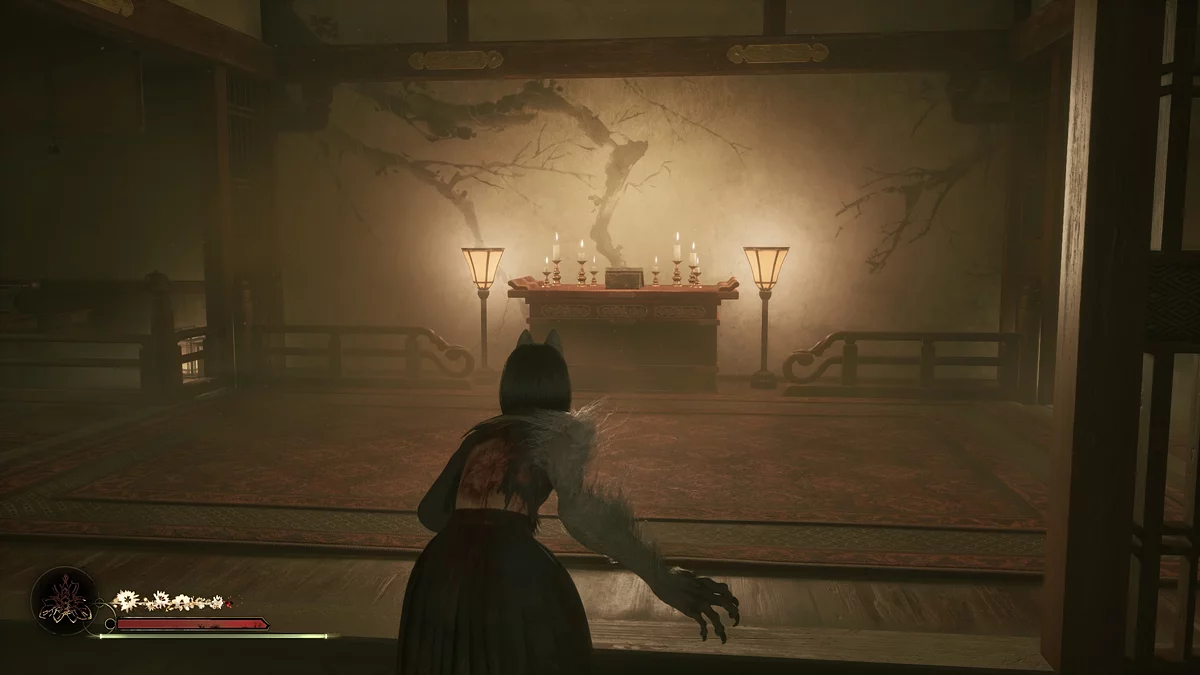 На последнем этапе предстоит убить матку и двух мечниц. Уничтожайте коконы, потому что из них вылупляются безликие. После победы достаньте из коробки герб с лисьей маской, посмотрите катсцену диалога Хинако с сестрой и вернитесь в зал с росписью.
