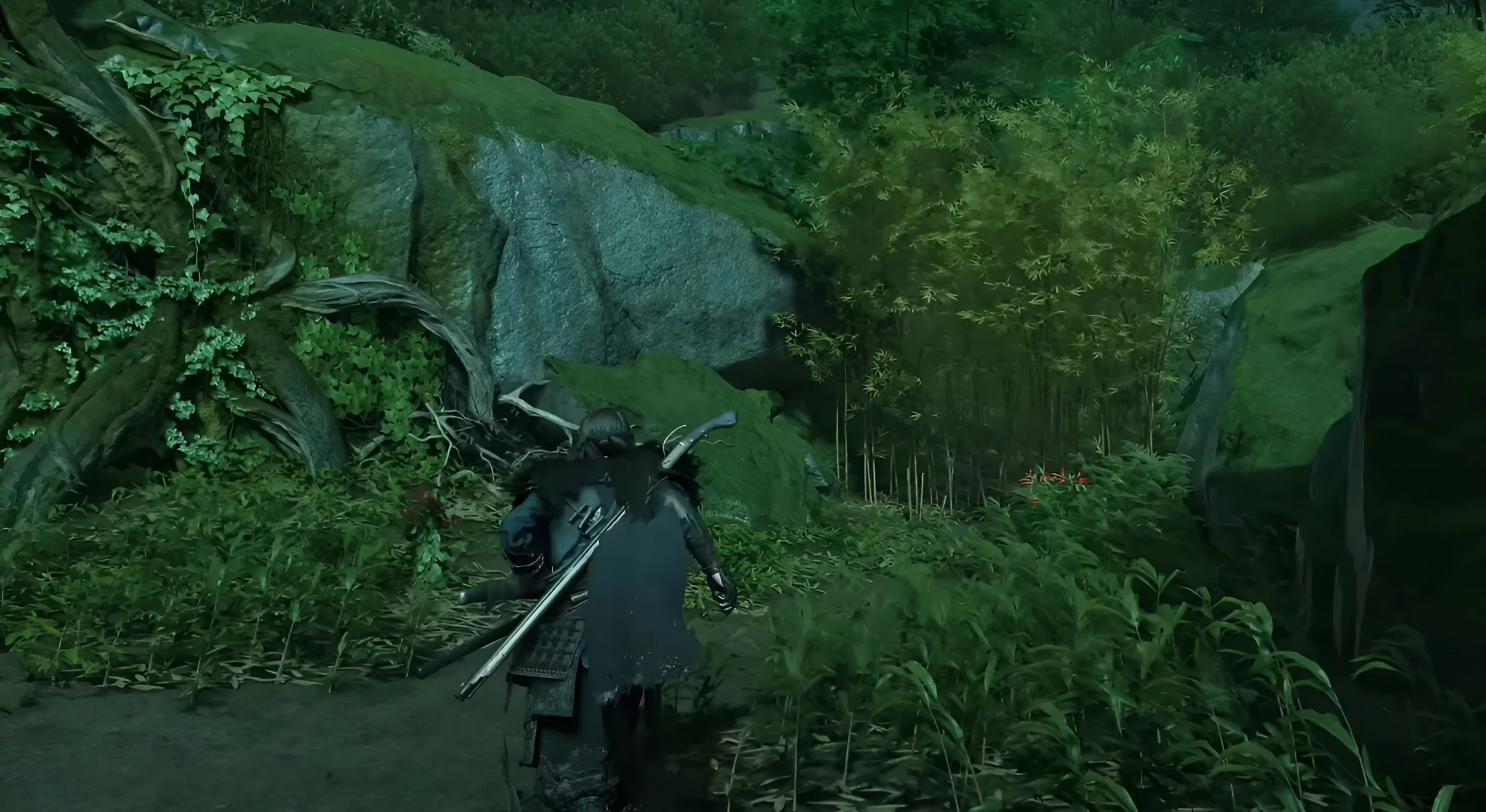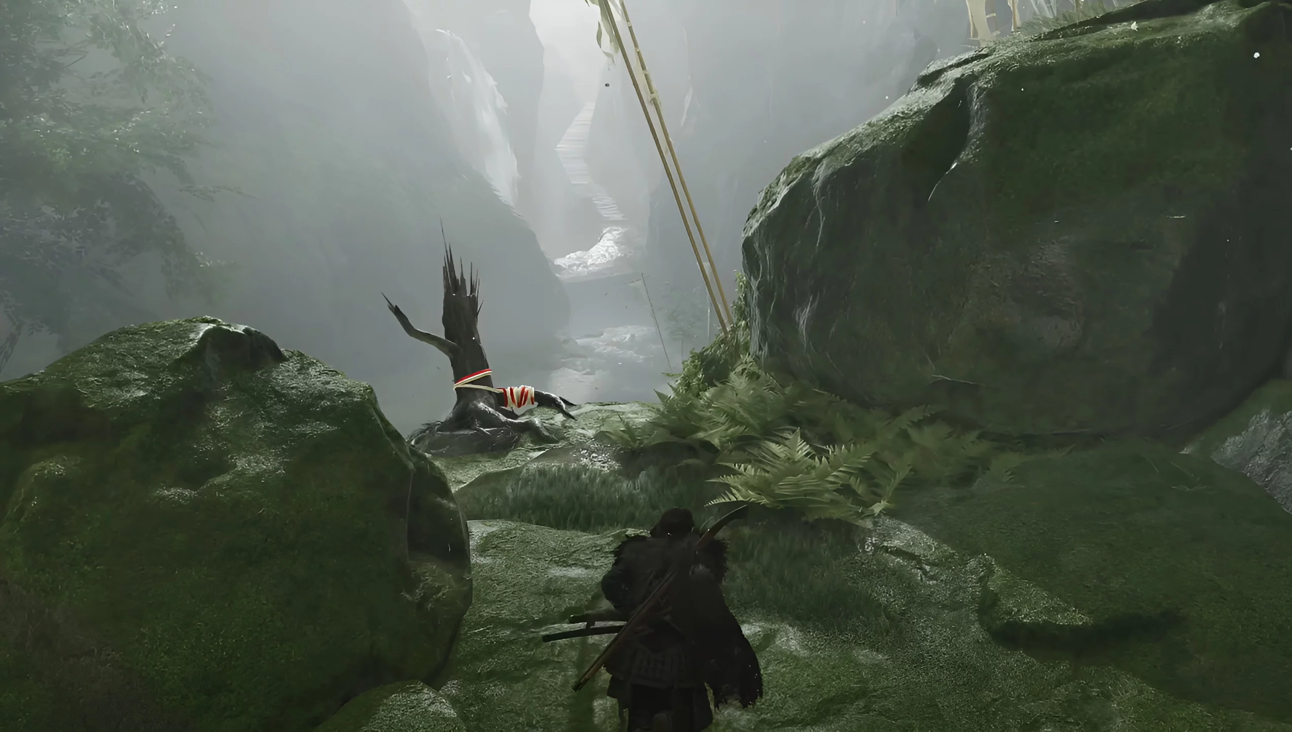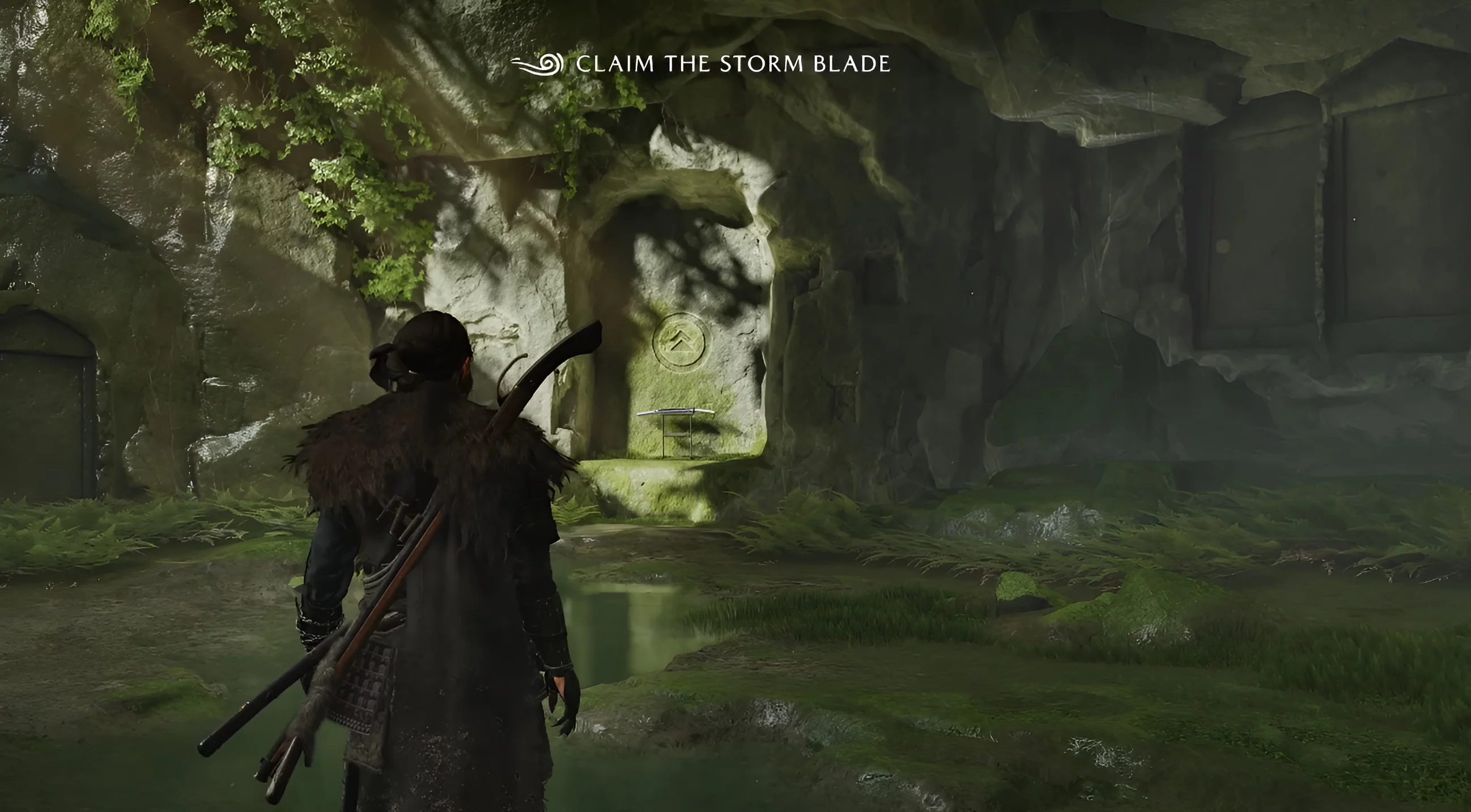 Прыгайте на вершину водопада, проходите вперёд и протискивайтесь через трещину в скале. Затем бегите направо и перебирайтесь через лаз с левой стороны. Так вы попадёте в тайную локацию, где лежит клинок Дзина.