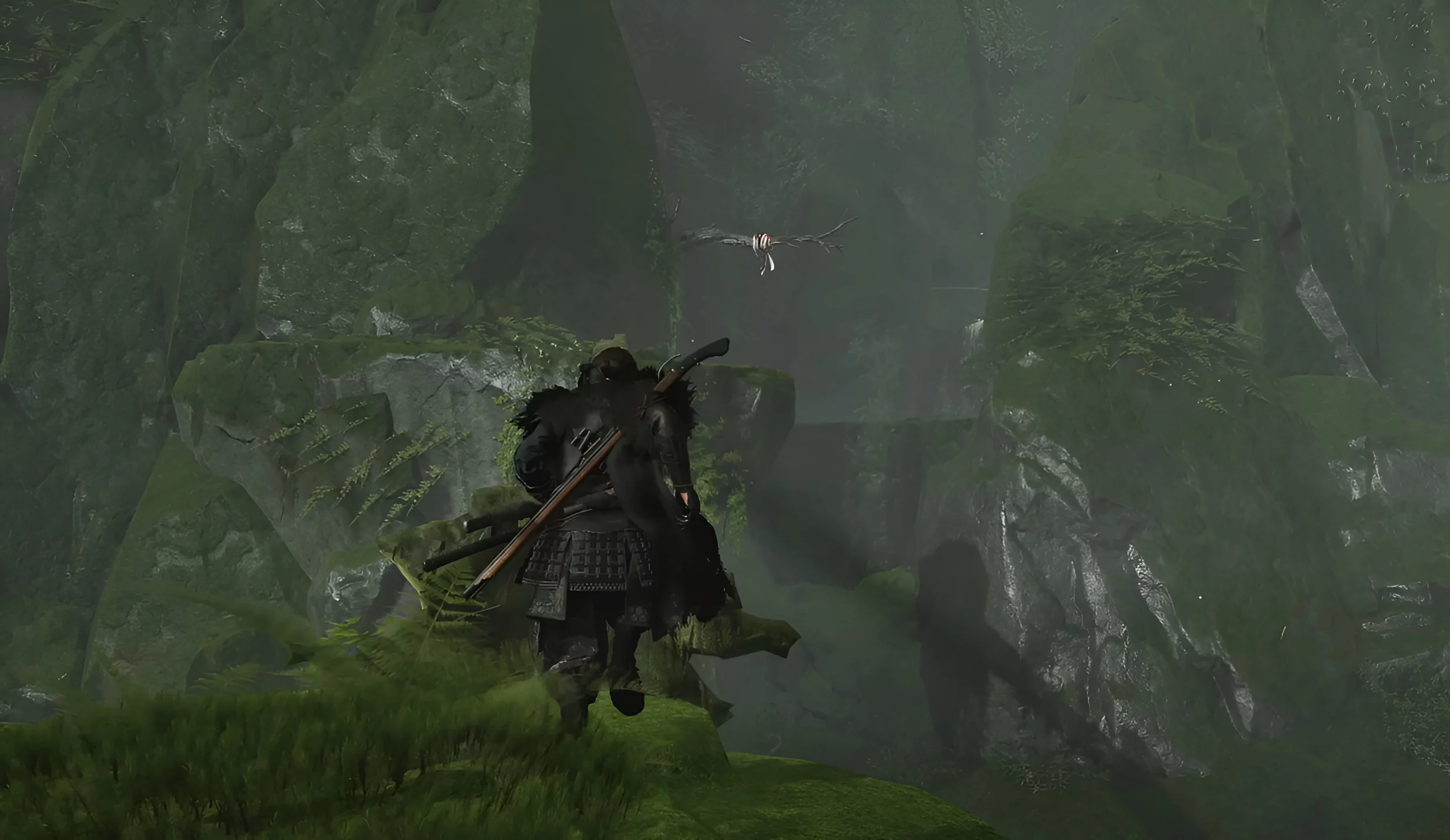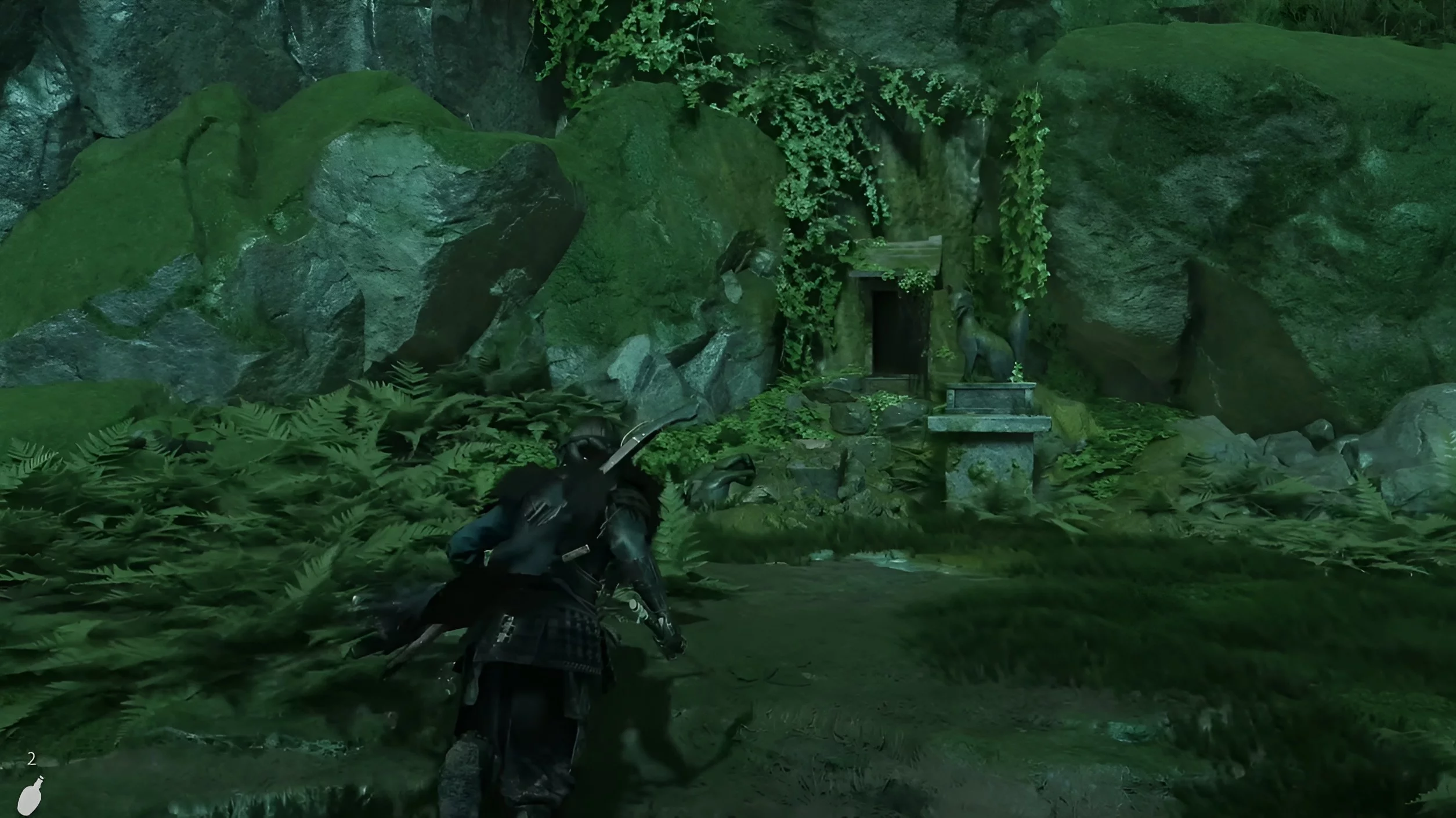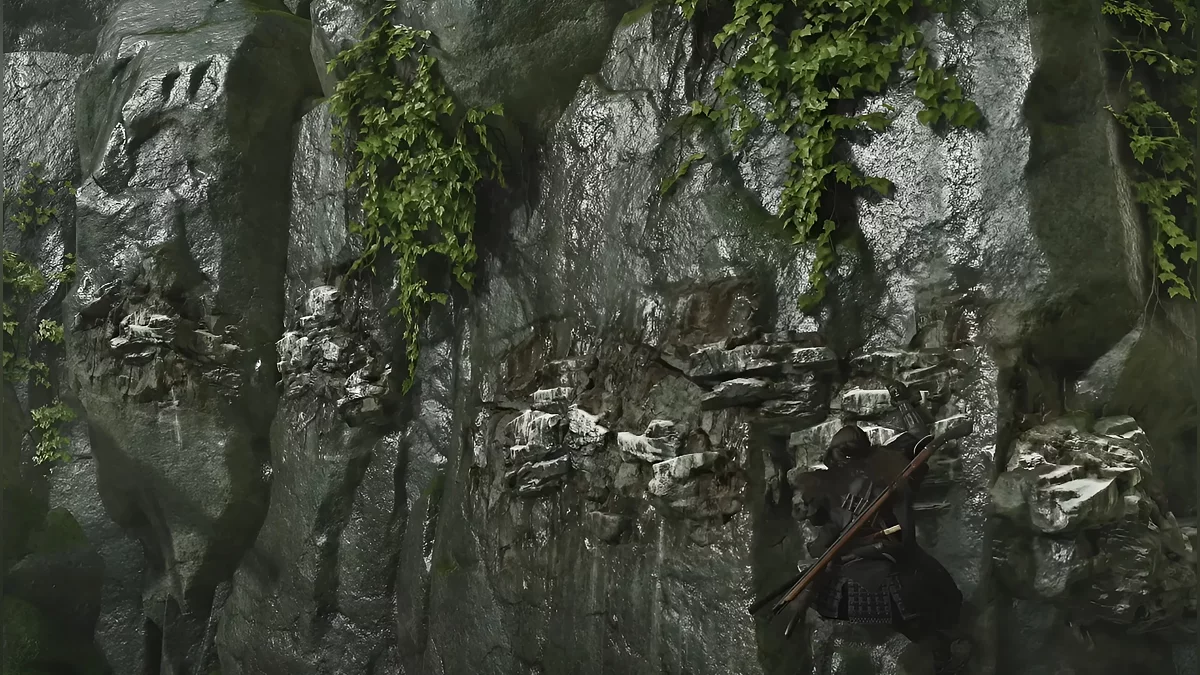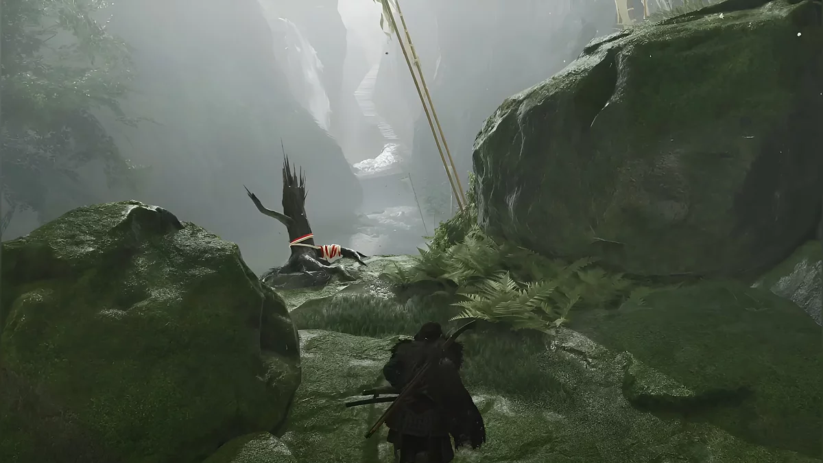 Забирайтесь на скалу, которая расположена позади вас, перепрыгивайте на другую сторону и по уступчикам двигайтесь направо. Зверёк приведёт вас в новую локацию. Справа находится секретное логово синоби, где вы найдёте шлем Дзина Сакаи.