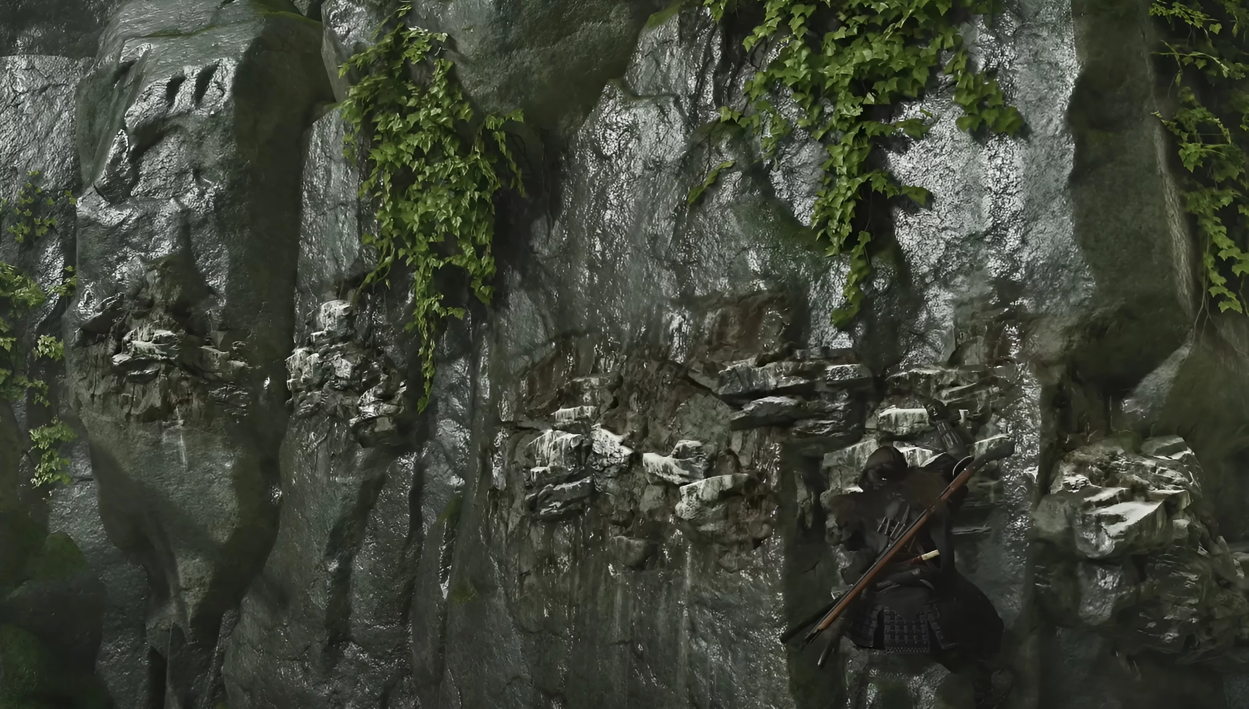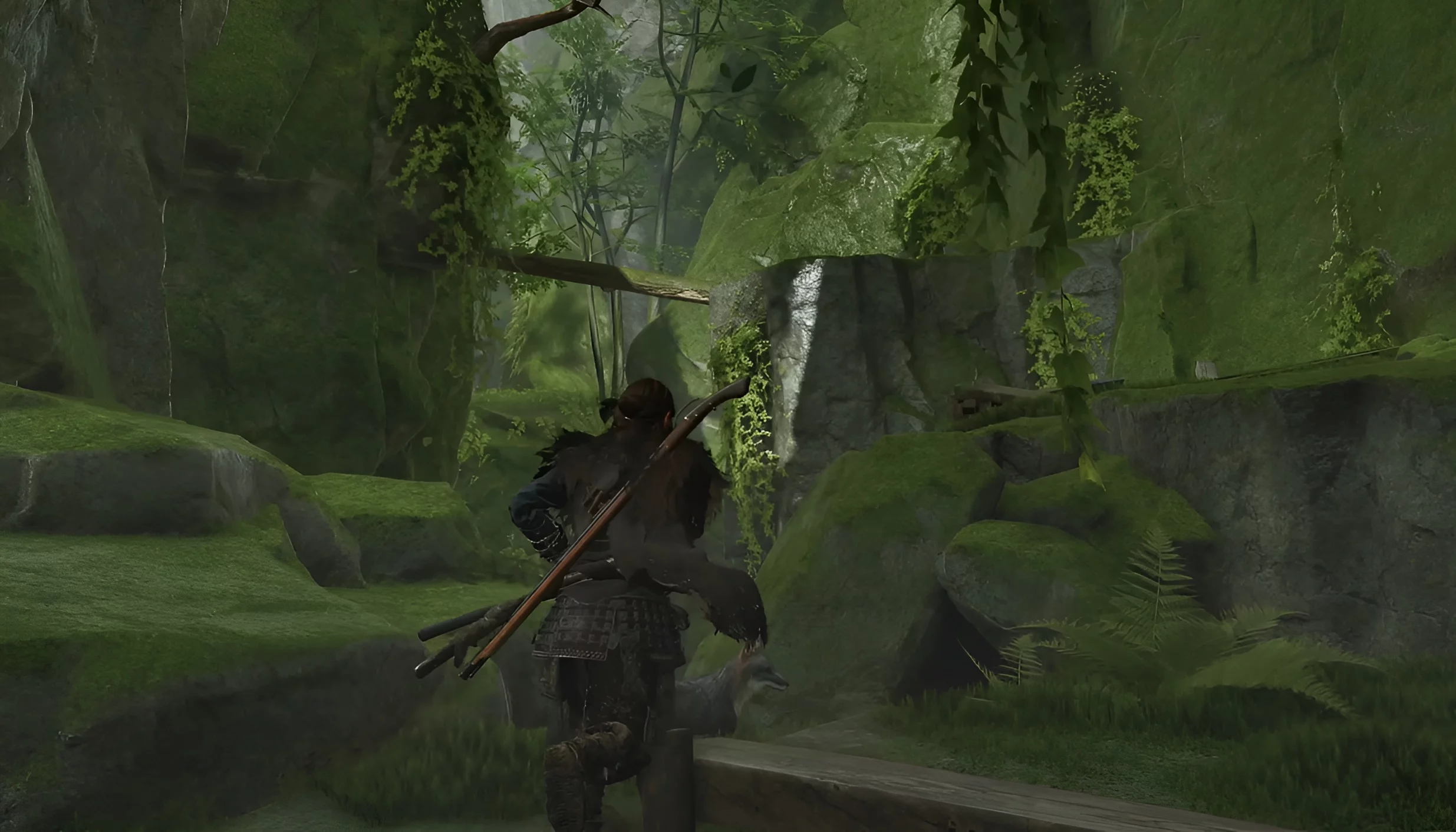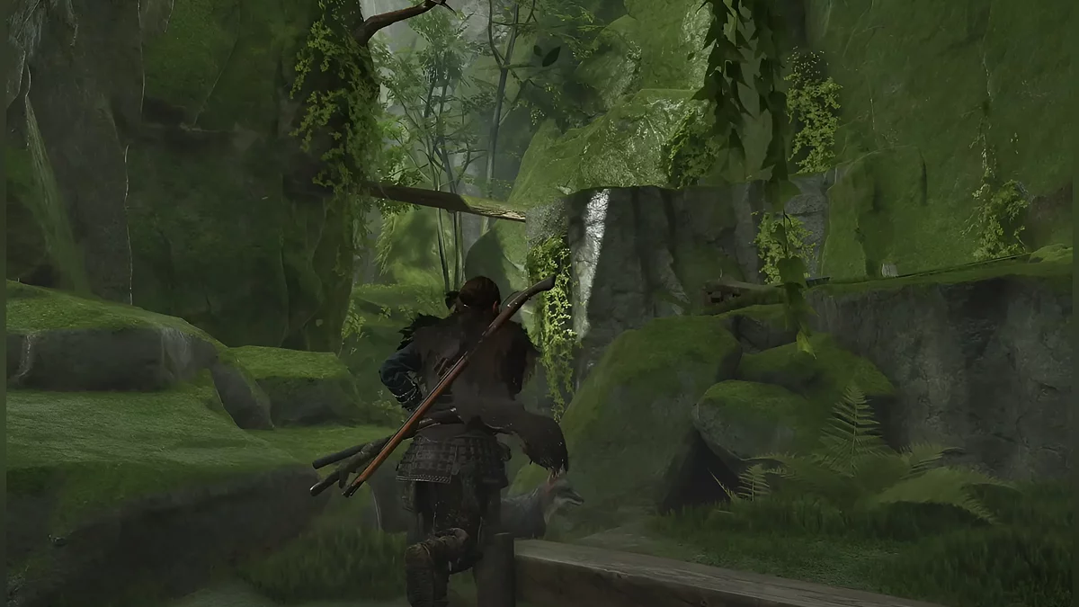 К сожалению, забрать оружие сразу не удастся — его украдёт другой воин. Одолейте рядовых врагов, а затем преследуйте воришку. Выбирайтесь через лаз, протискивайтесь в трещину и прыгайтесь вниз. После этого бегите в правую сторону. Мост обрушится, но вы продолжайте двигаться вперёд по руслу реки. Когда дойдёте до тупика, выбирайтесь на сушу и поднимайтесь наверх.