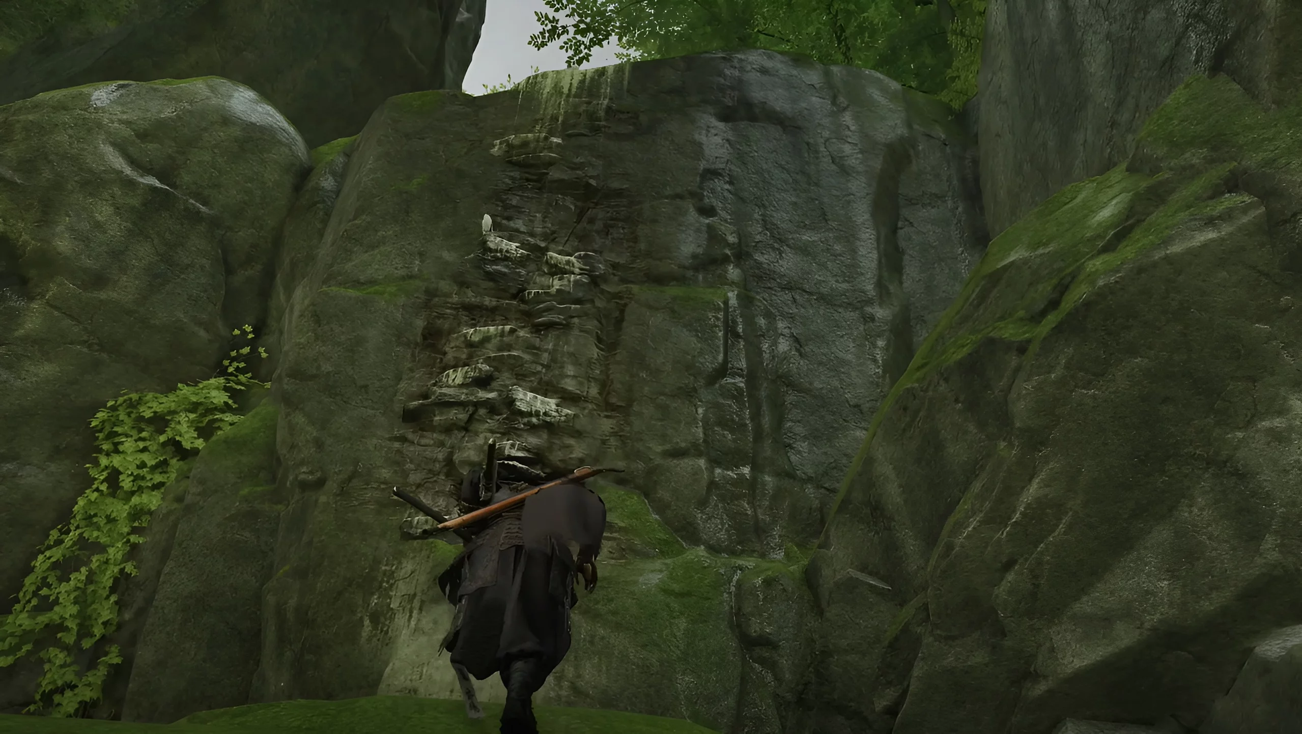 Перебирайтесь на другую сторону и забирайтесь наверх по скале справа. Двигайтесь вперёд до тупика. С правой стороны вы заметите расщелину, через которую можно протиснуться. Обыщите сундук около дерева. Там находится текст, который нужно прочесть.