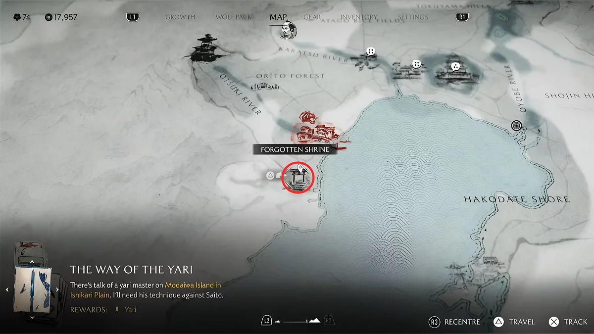 Отправляйтесь на Побережья Осимы. Южнее леса Орито расположено Забытое святилище, которое вам нужно посетить. Можете ориентироваться по нашей карте.