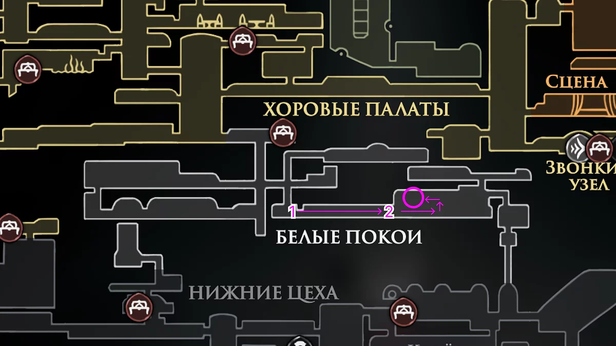 Следующим шагом станет открытие локации «Белые покои» в южной части Цитадели с помощью Белого ключа. Ключ можно найти у самой правой части Уголка песни или же купить у торговки Юбиланы после завершения соответствующего задания.
