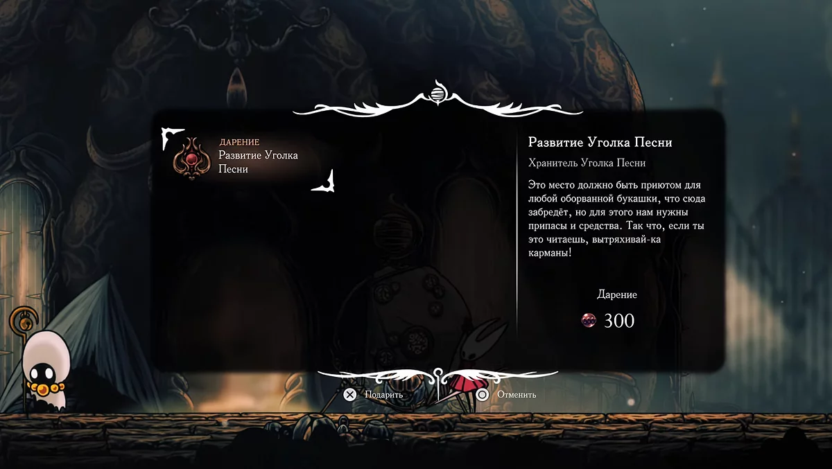 Как и все поселения в Hollow Knight: Silksong, Уголок песни имеет местные поручения, среди которых находится желание «Развитие Уголка Песни». Подарите городу 300 бусин для его выполнения. Через некоторое время к первому алтарю придет наш давний знакомый — Шерма.