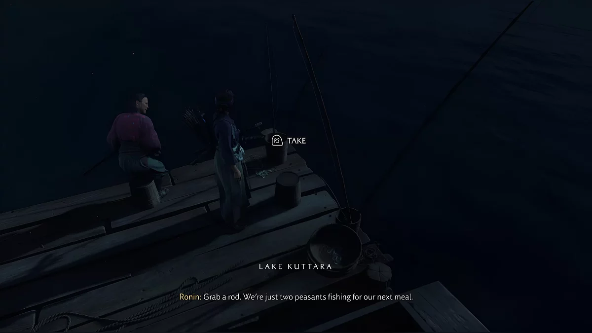 Присоединитесь к нему и возьмите удочку, а после кат-сцены двигайтесь за воином. Около дома нужно устранить двух разбойников.