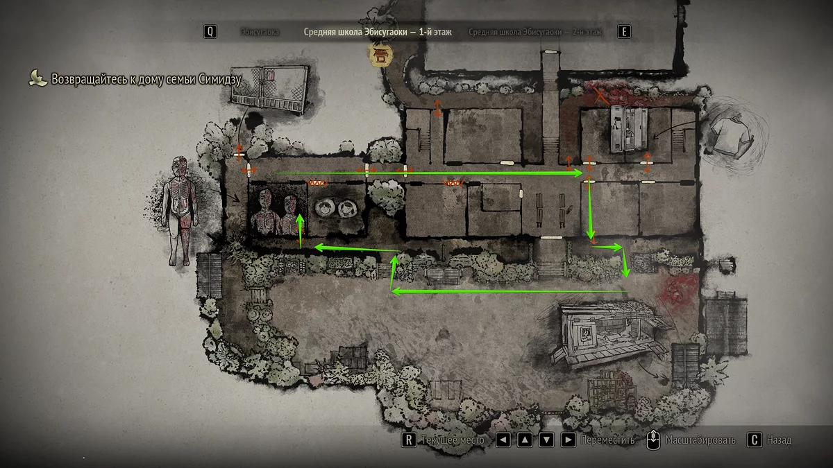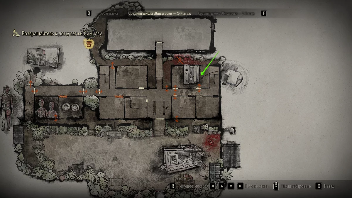 Попадите в среднюю школу и отыщите ключ от второго этажа. Затем поднимитесь в класс Хинако и решите головоломку с ящиком. Теперь войдите в соседнюю аудиторию, найдите металлический ключ от второй пристройки и отыщите в северном корпусе ключ от раздевалки.